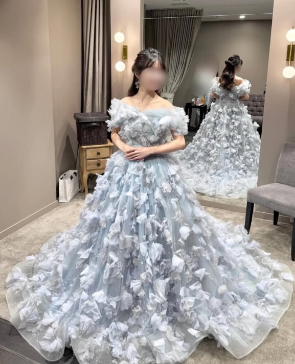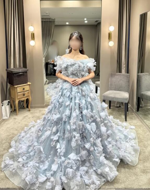 カラードレス 薄青 3D立体レース刺繍 フリルオフショルダー 韓国風ドレス 華やかなトレーン ブライダル