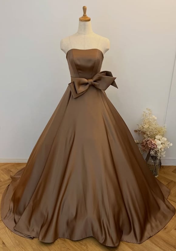 カラードレス ブラウン リボン 光沢サテン 編み上げ ビスチェドレス 華やかなトレーン 花嫁 前撮り