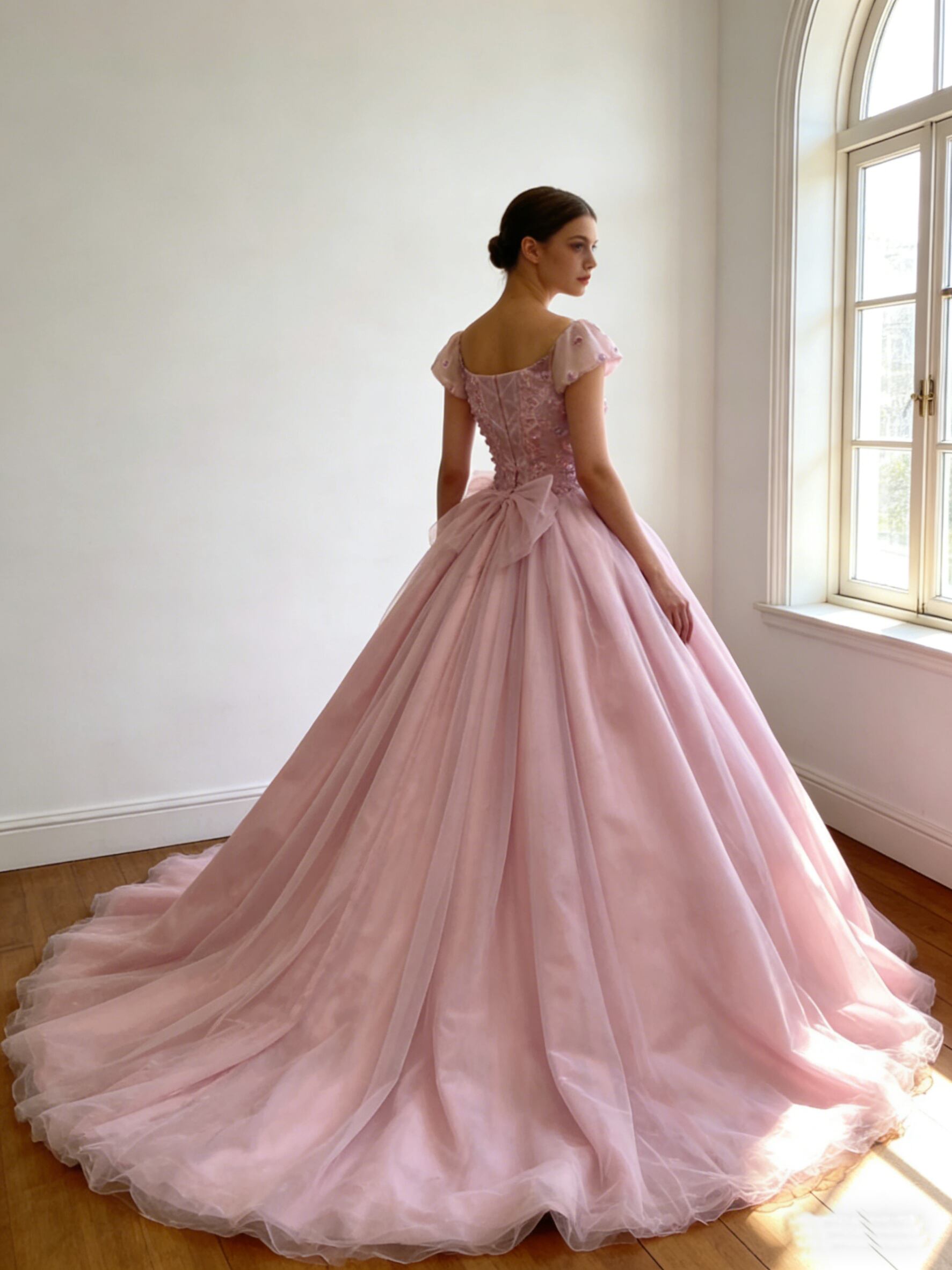カラードレス ピンク ふっくら柔らかなバックリボン 繊細なレース ソフトチュール 華やかなトレーン 花嫁