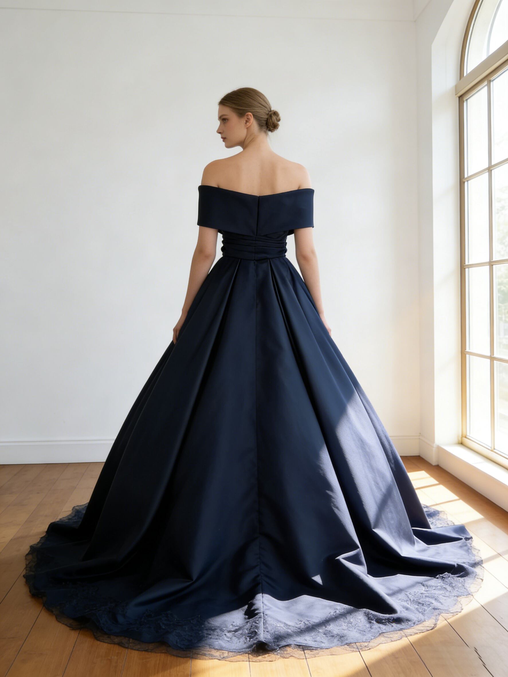 カラードレス ネイビー オフショルダー 光沢サテン フリルトレーン 演奏会/音楽会
