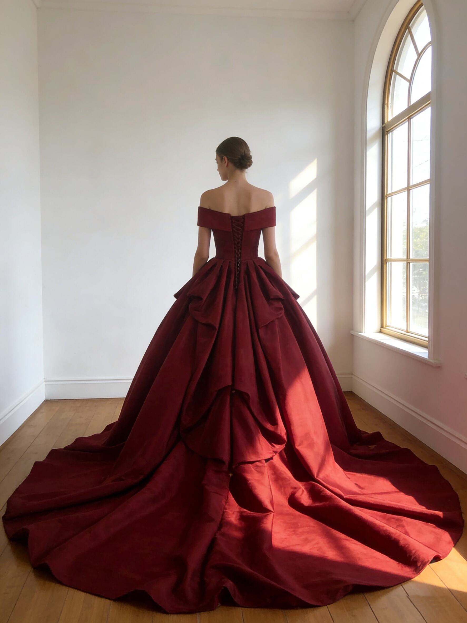 カラードレス ボルドー色 オフショルダー 光沢サテン 華やかなトレーン 花嫁 前撮り