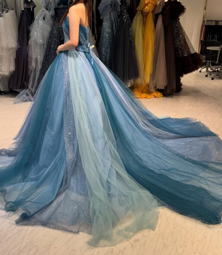 カラードレス ブルー グラデーションドレス シークインチュール 華やかなトレーン ビスチェドレス 花嫁