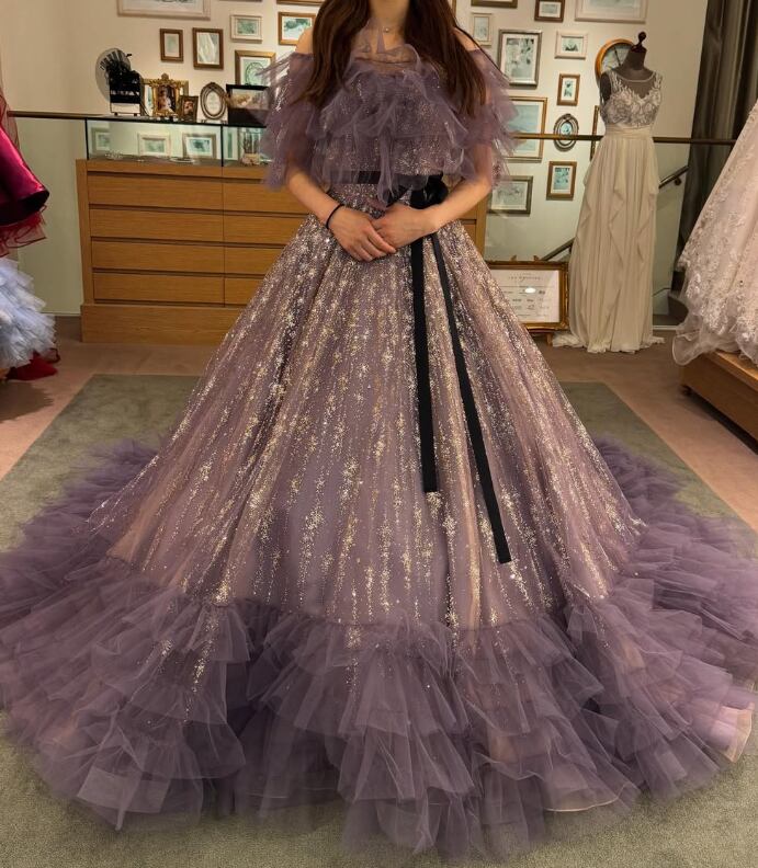 カラードレス パープル フリルトレーン サッシュベルト フリルオフショルダー 花嫁