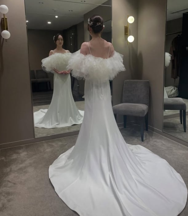 ウエディングドレス オフホワイト オフショルダー 細見えシルエット スレンダーライン 結婚式 前撮り