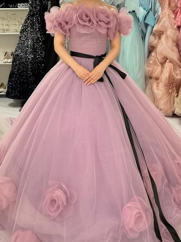 カラードレス ピンク フリルオフショルダー バラトレーン サッシュベルト ロングトレーン 結婚式