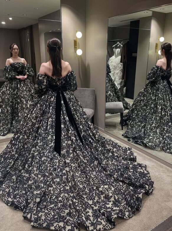 カラードレス ブラック 取り外し可能な付け袖 サッシュベルト 華やかなトレーン ジャガード生地 演奏会/音楽会