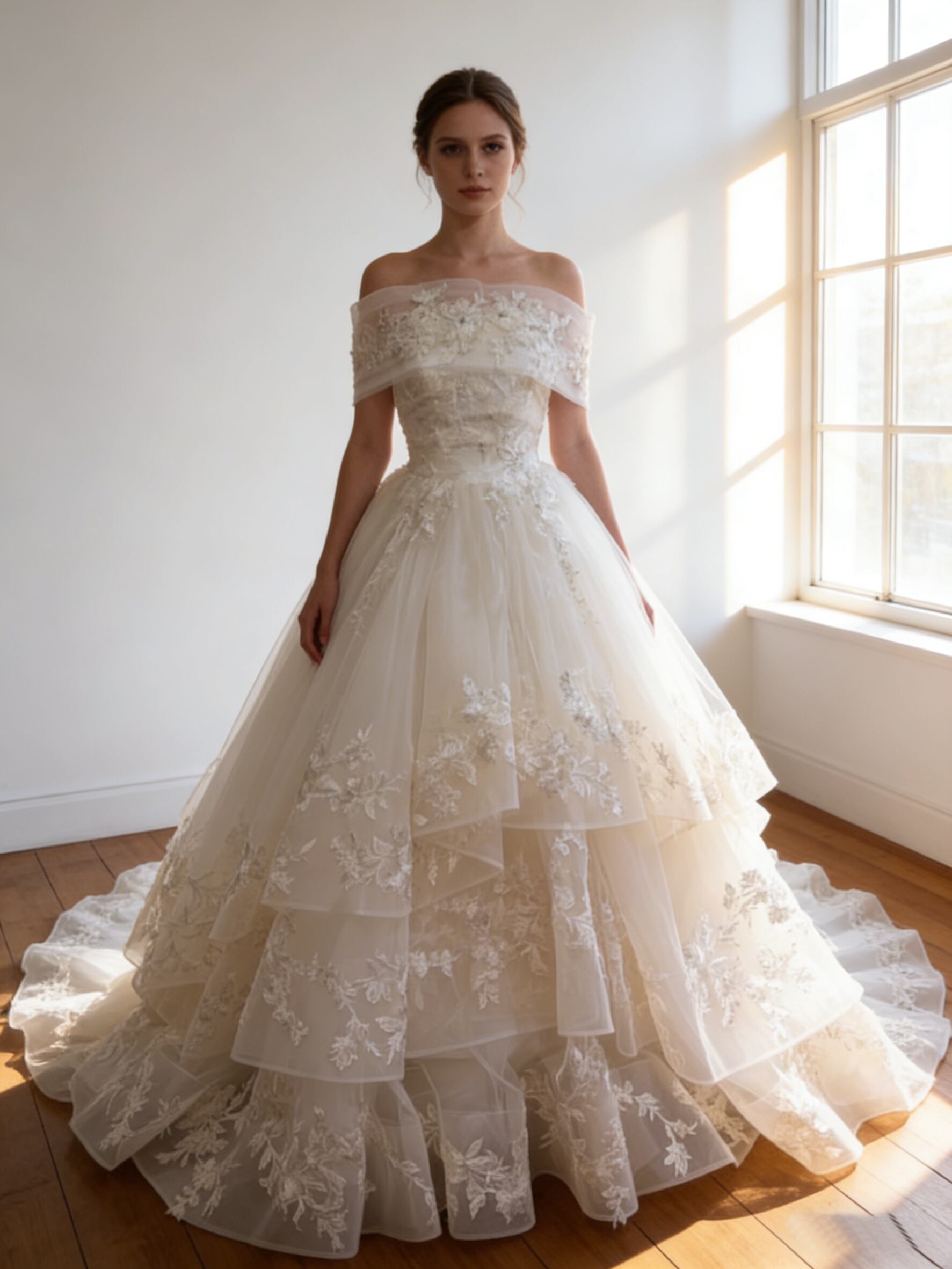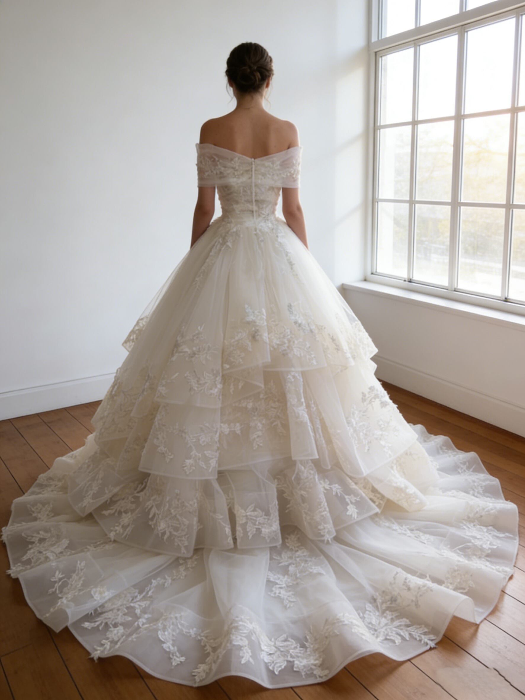 ウエディングドレス オフホワイト オフショルダー 繊細なレース 華やかなトレーン ブライダル