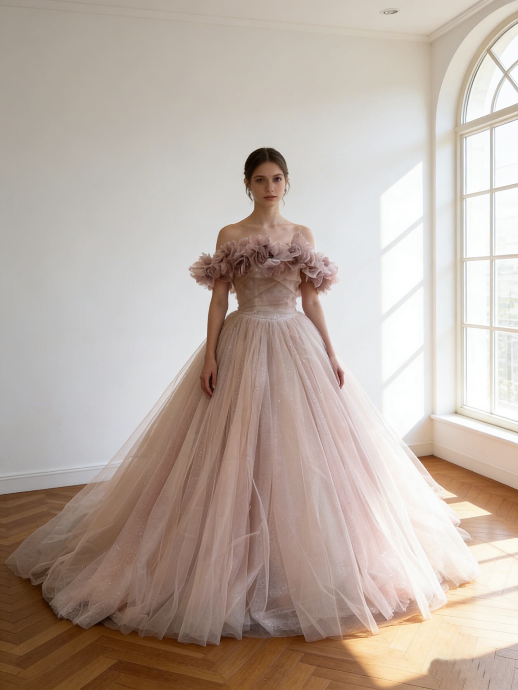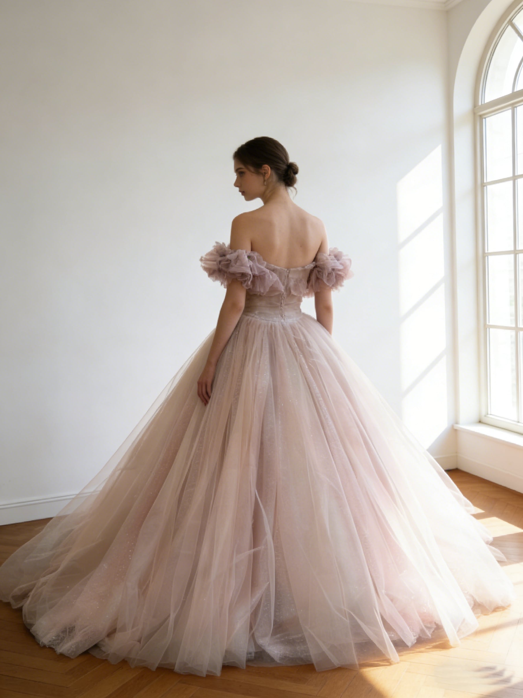 カラードレス ピンク オフショルダー シークインチュール ソフトチュール 花嫁 前撮り