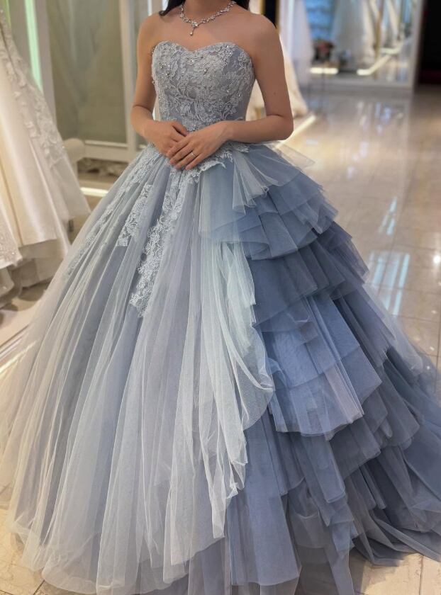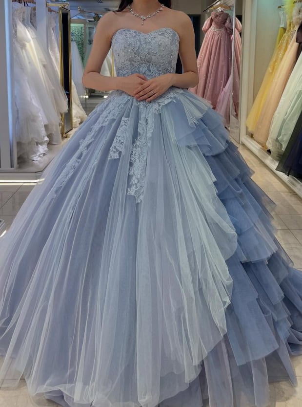 カラードレス ブルー グラデーションドレス 花柄モチーフで刺繍が美しい 編み上げ ソフトチュール 花嫁 演奏会/音楽会