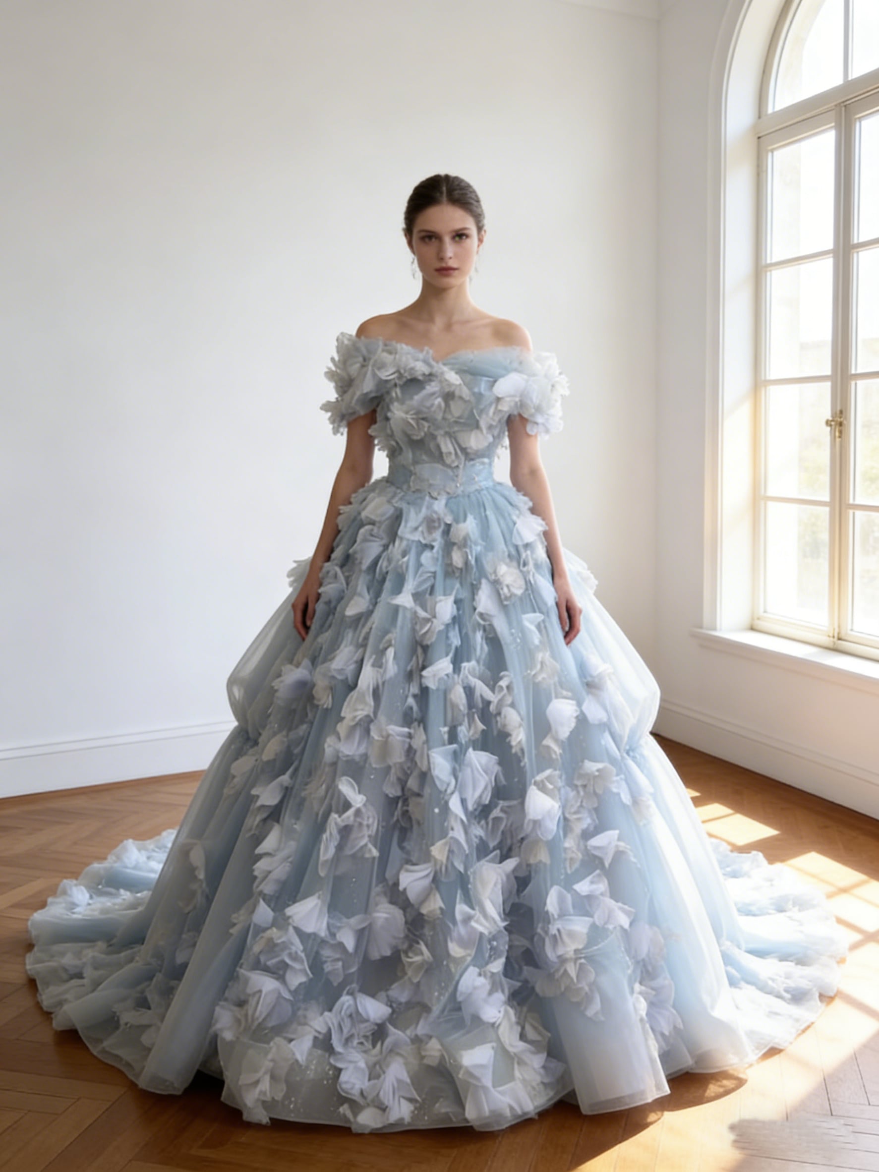 カラードレス 爽やかで優しいブルー オフショルダー 3D立体レース刺繍 シークインチュール ブライダル
