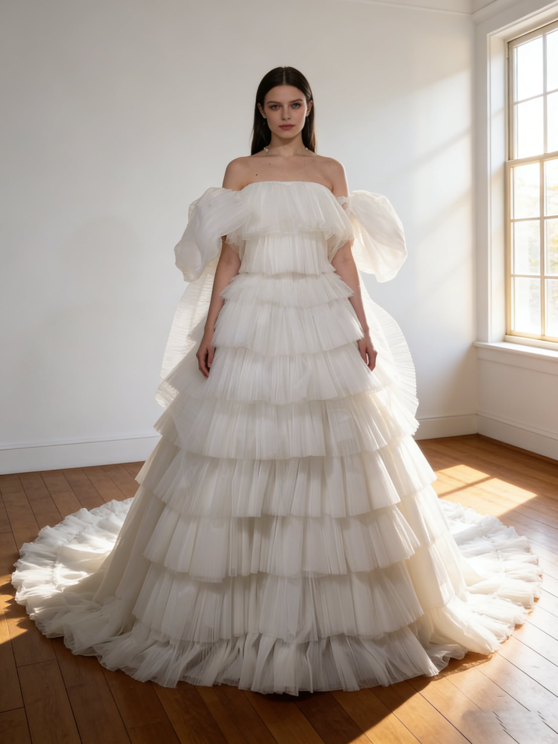 ウエディングドレス オフホワイト 取り外し可能な付け袖 ソフトチュール 華やかなトレーン ブライダル