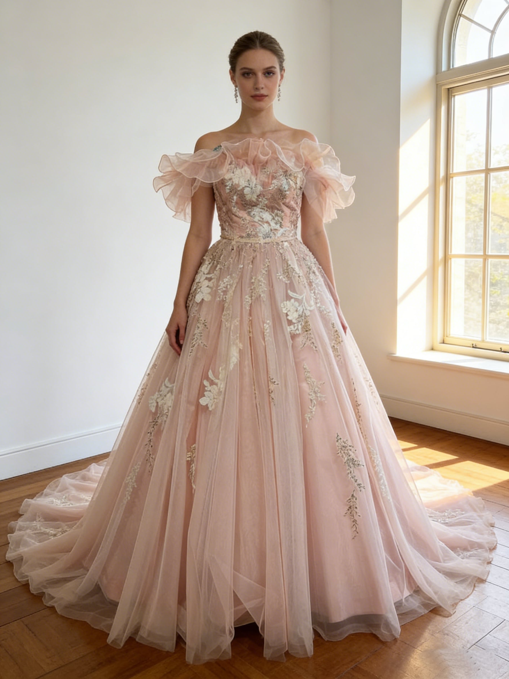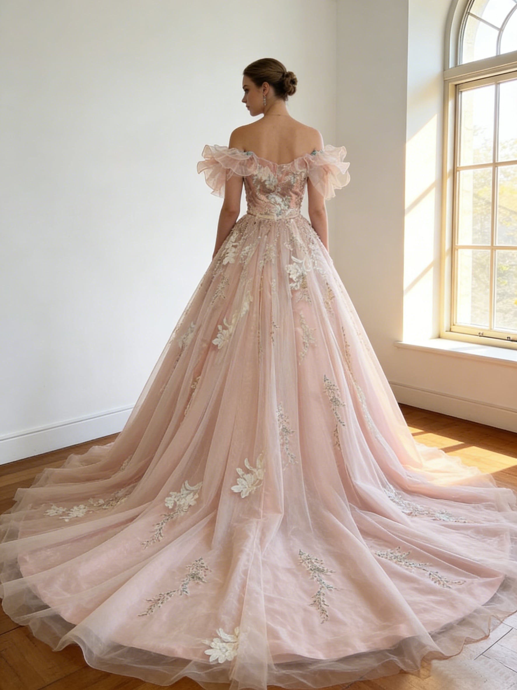 カラードレス ピンク オフショルダー 花柄モチーフで刺繍が美しい 華やかなトレーン 演奏会/音楽会