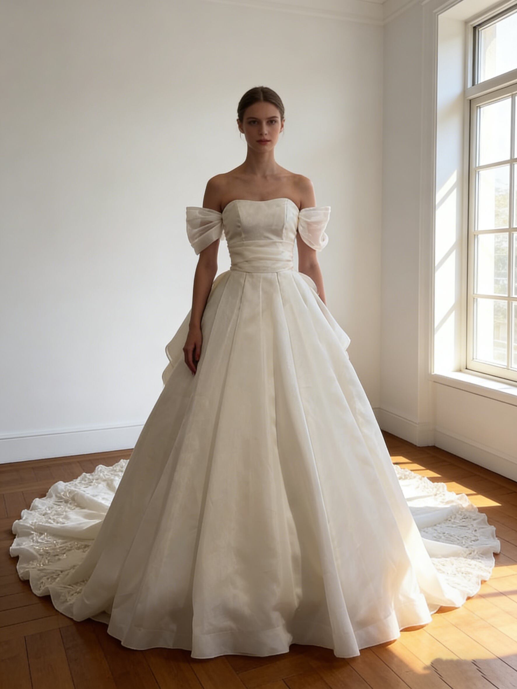 ウエディングドレス オフホワイト 取り外し可能な付け袖 繊細なレース 華やかなトレーン 結婚式
