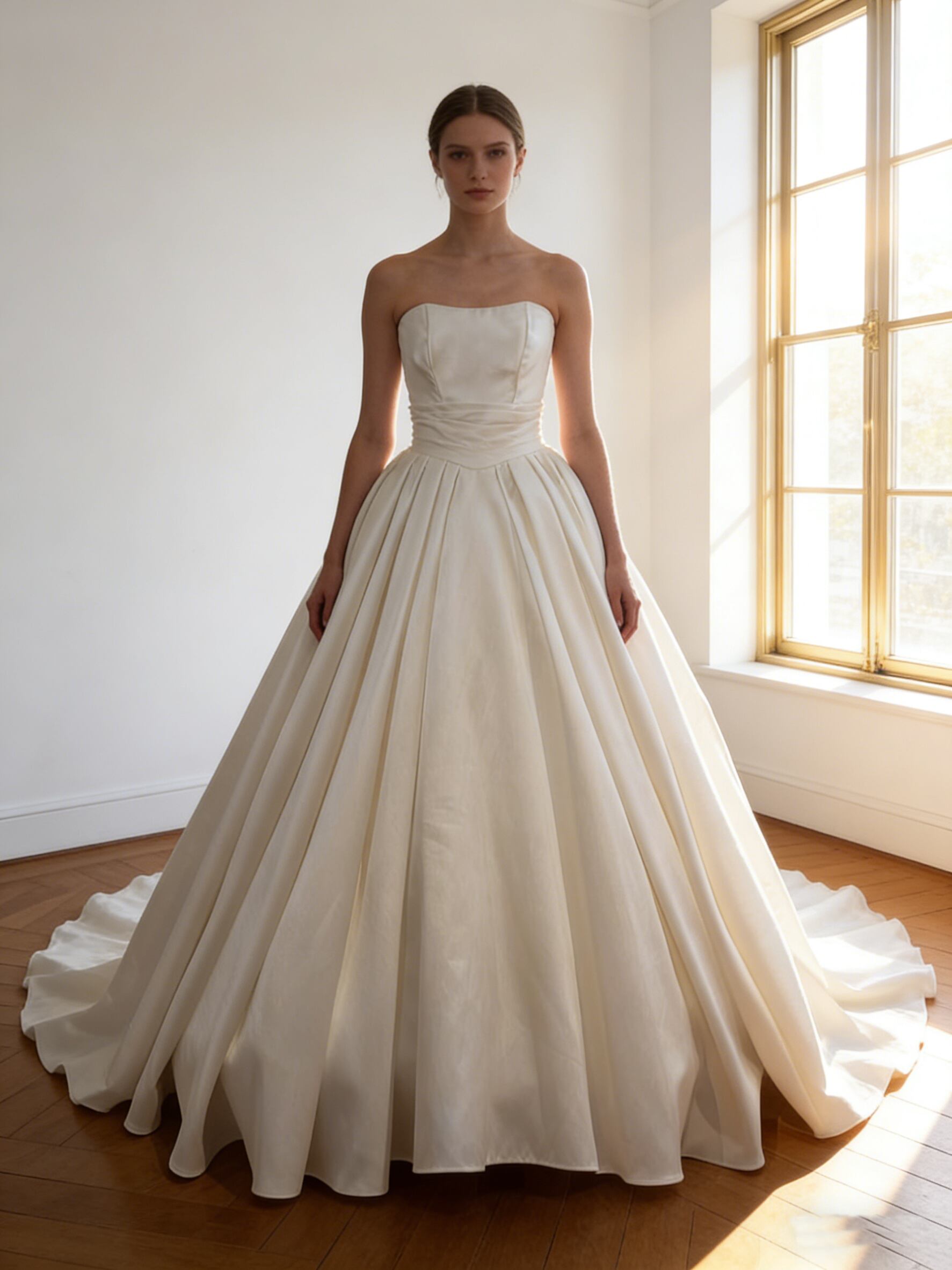 ウエディングドレス オフホワイト ビスチェドレス 光沢サテン 華やかなトレーン ブライダル