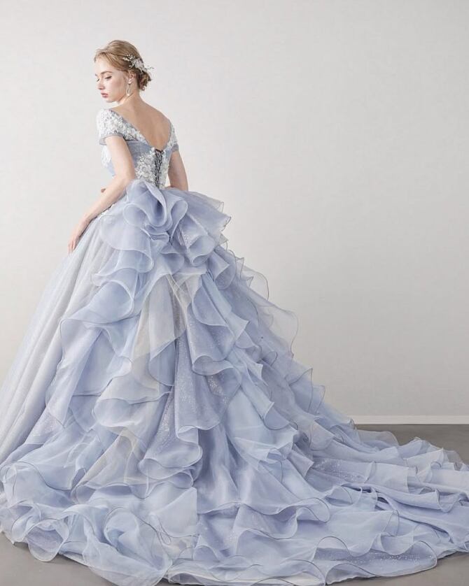 カラードレス 爽やかで優しいブルー 花柄モチーフで刺繍が美しい 取り外し可能な襟 編み上げ 華やかなトレーン ラッフルフリル 花嫁