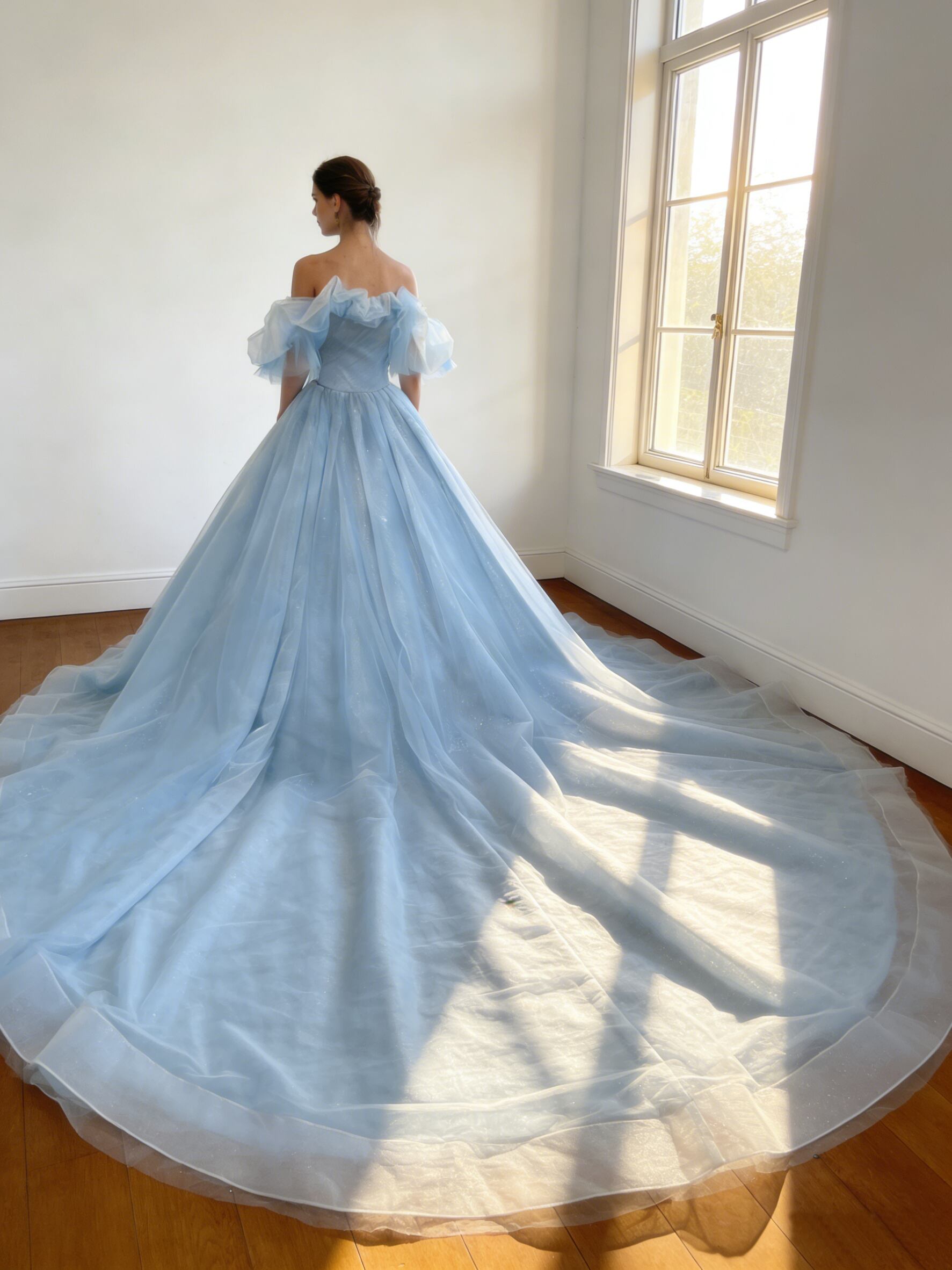 カラードレス 爽やかで優しいブルー オフショルダー シークインチュール 華やかなトレーン ブライダル