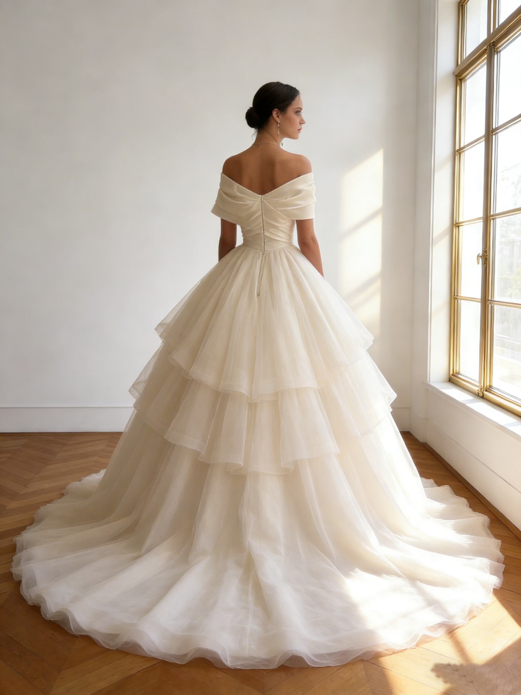 ウエディングドレス オフホワイト オフショルダー 華やかなトレーン ソフトチュール ブライダル