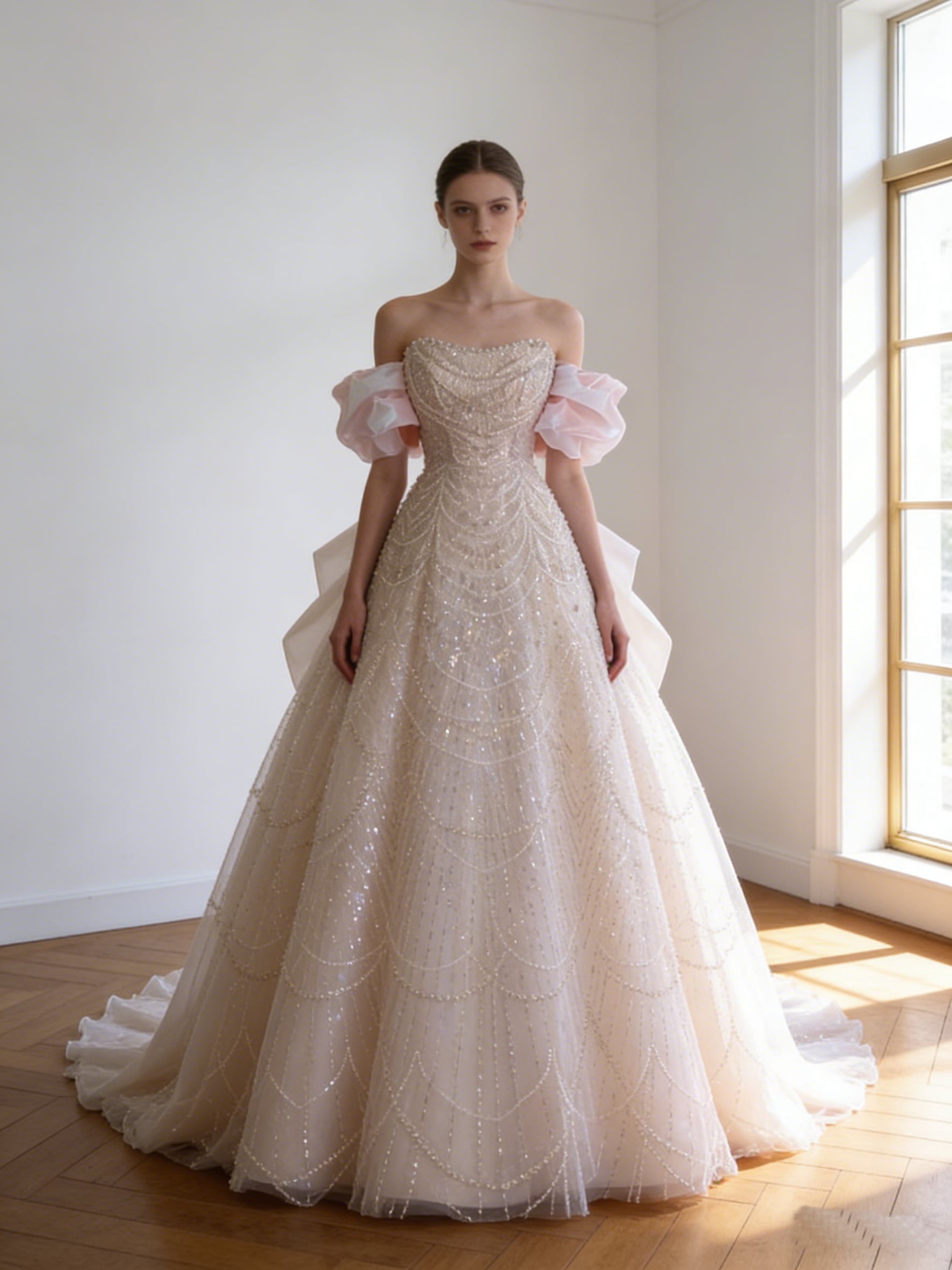 カラードレス ピンク シークインチュール ウェーブ ロングトレーン 取り外し可能な付け袖 韓国風ドレス 憧れのドレス ブライダル
