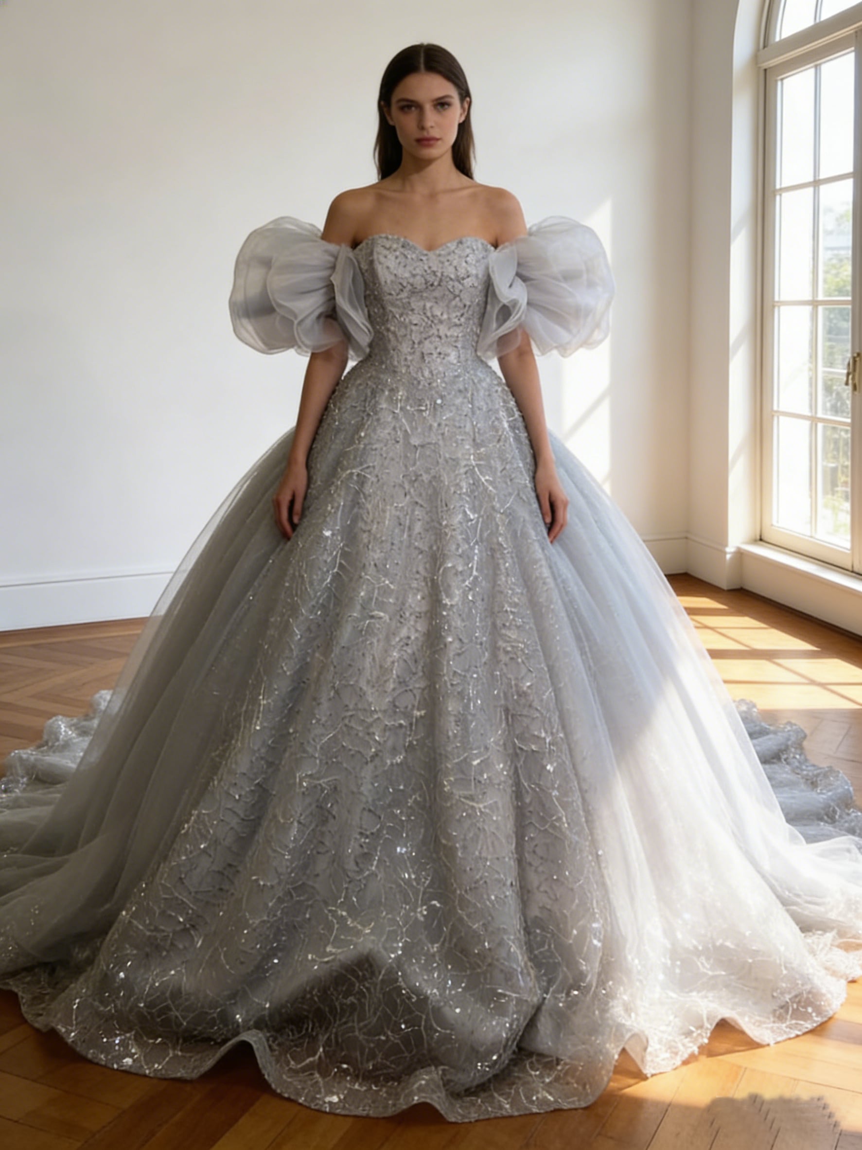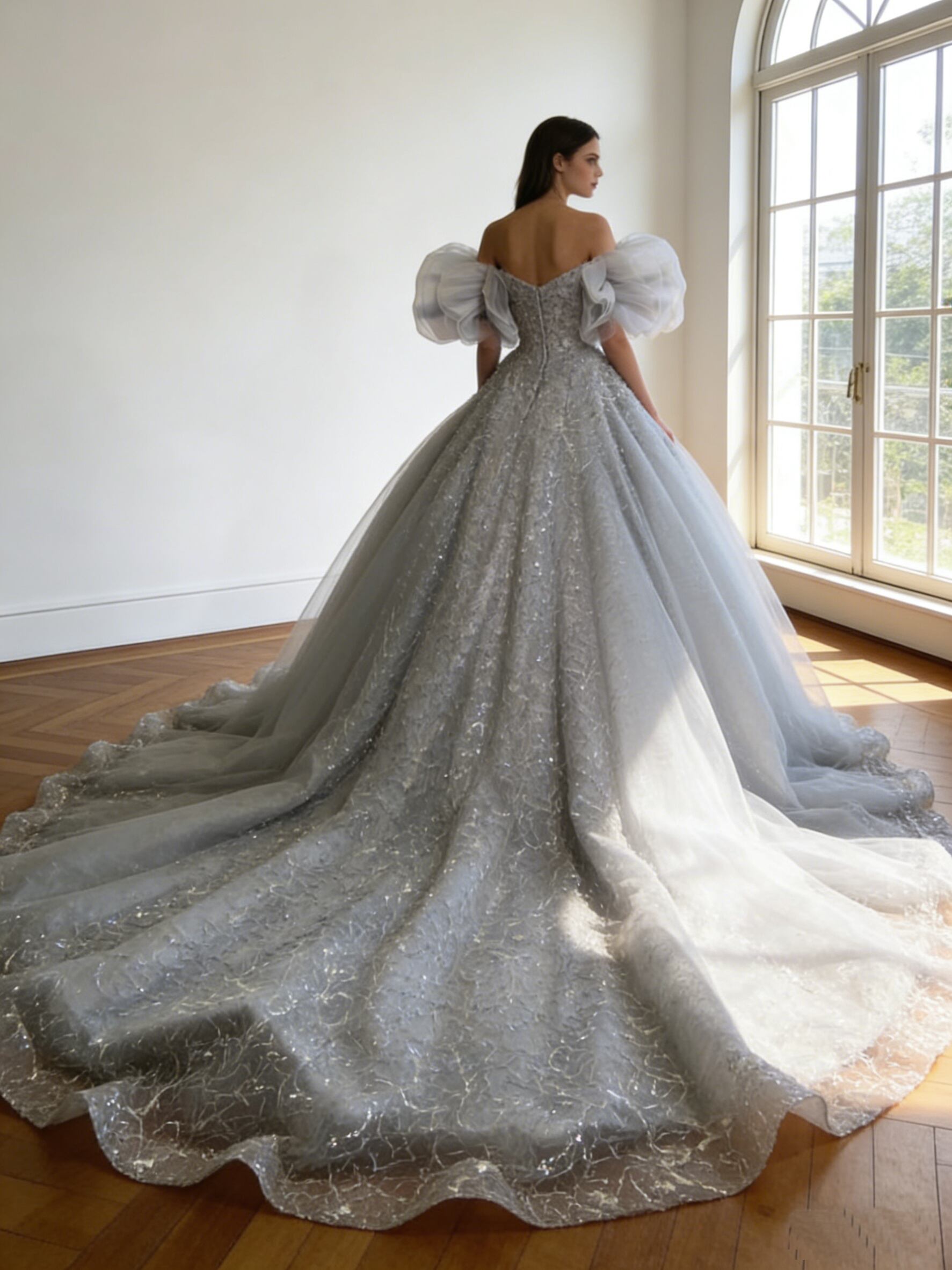 カラードレス シルバーグレー キラキラ光る刺繍 取り外し可能な付け袖 華やかなトレーン 演奏会/音楽会