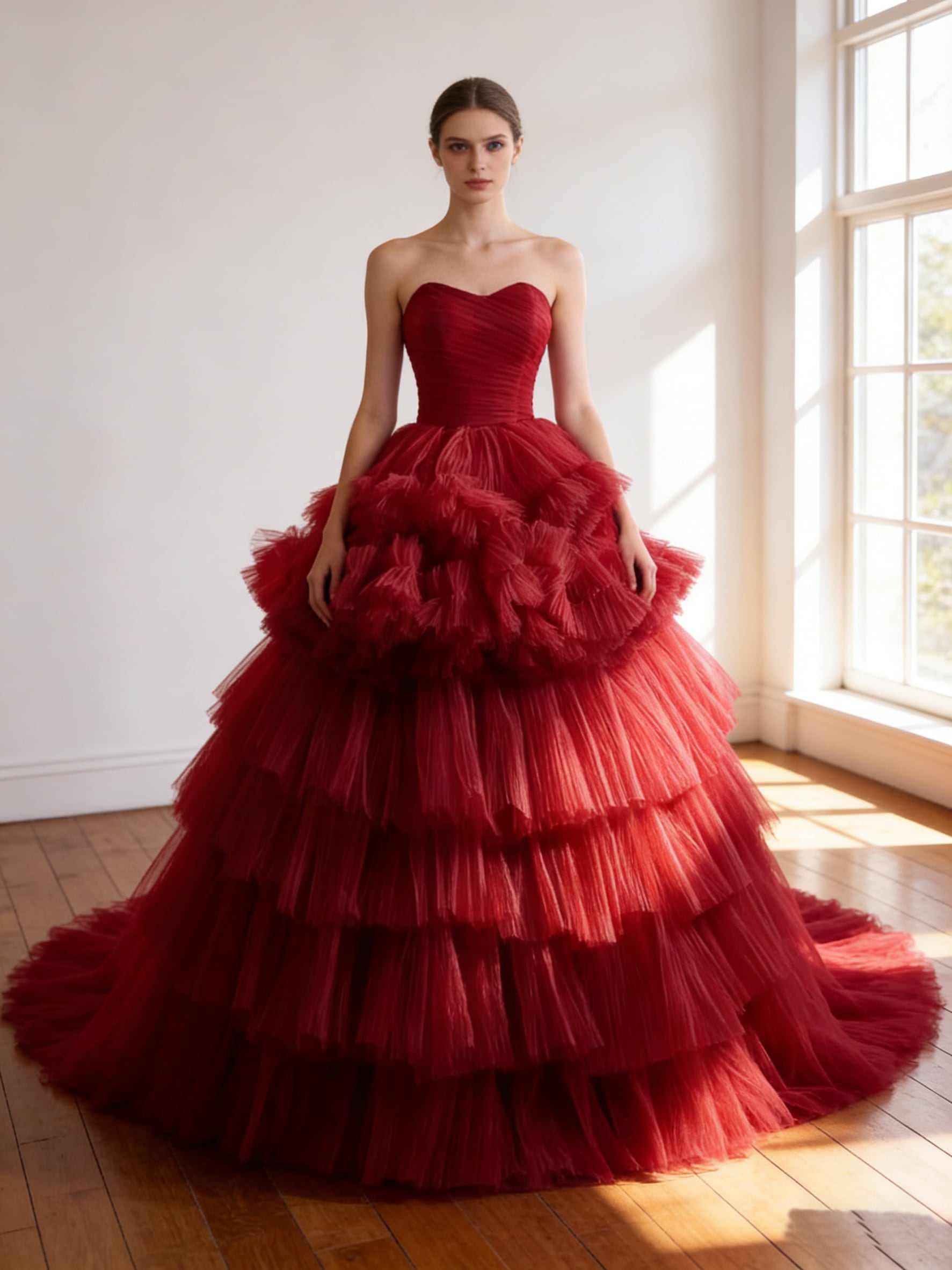 カラードレス ワインレッド ソフトチュール ビスチェドレス 目立つ 華やかなトレーン 花嫁 前撮り