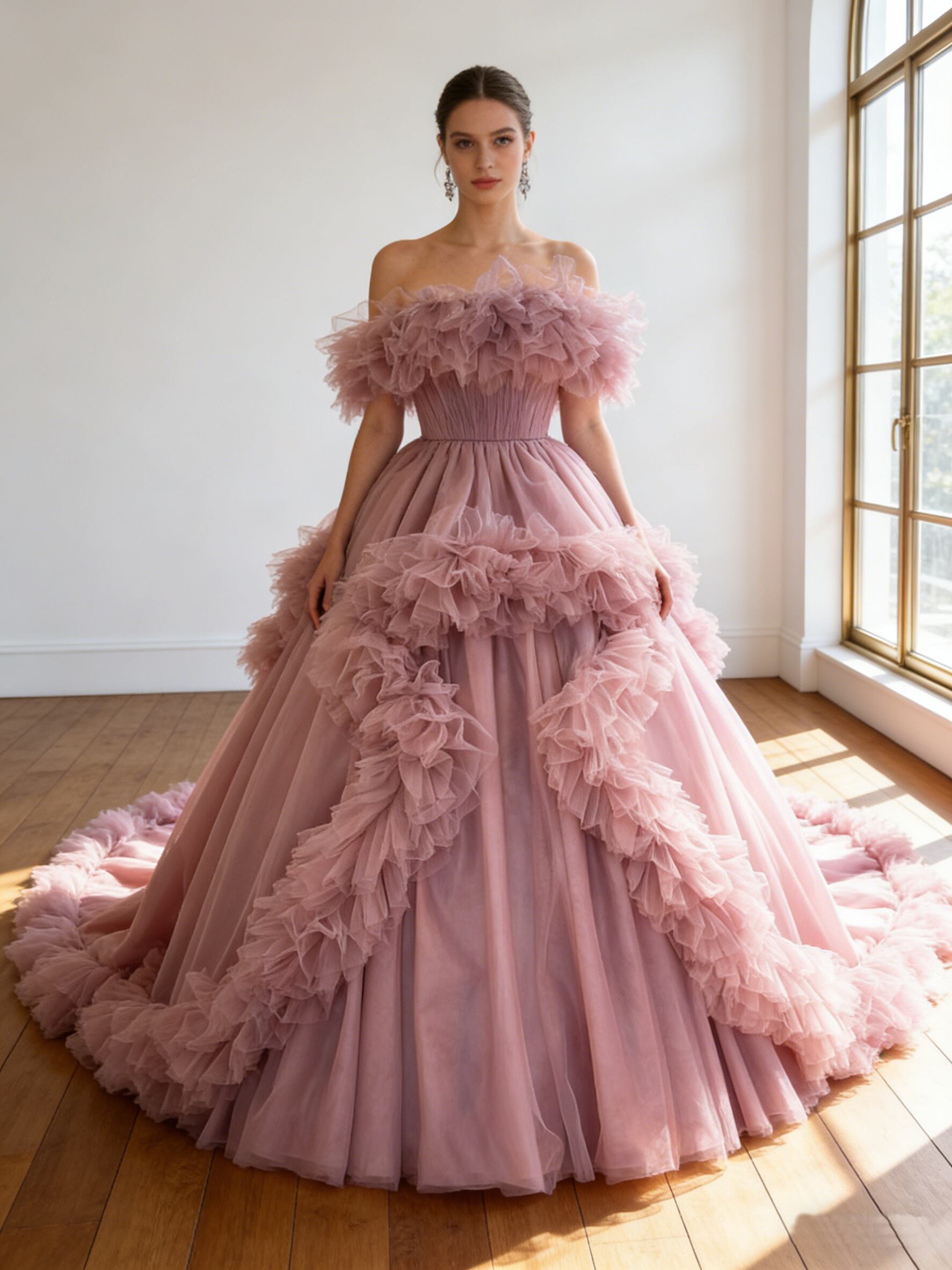 カラードレス ピンク オフショルダー ボリュームドレス フリルトレーン 花嫁 前撮り