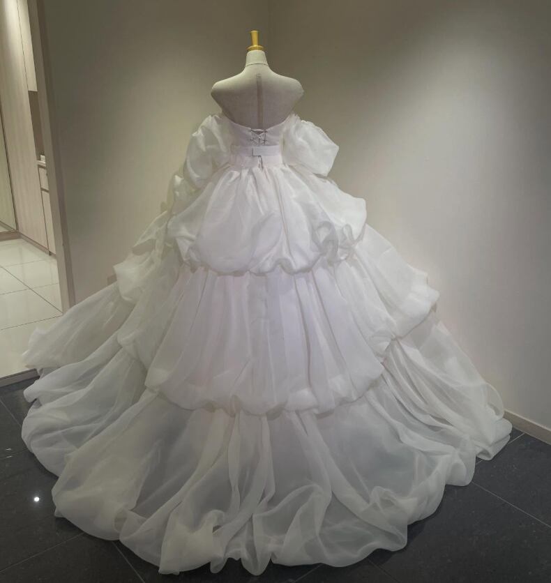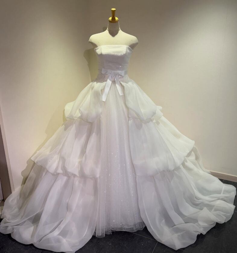 ウエディングドレス オフホワイトシークインチュール 取り外し可能な付け袖 サッシュベルト 華やかなトレーン 編み上げ ブライダル
