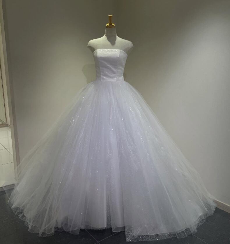 ウエディングドレス オフホワイト 取り外し可能な付け袖 シークインチュール 編み上げ 華やかなトレーン 結婚式