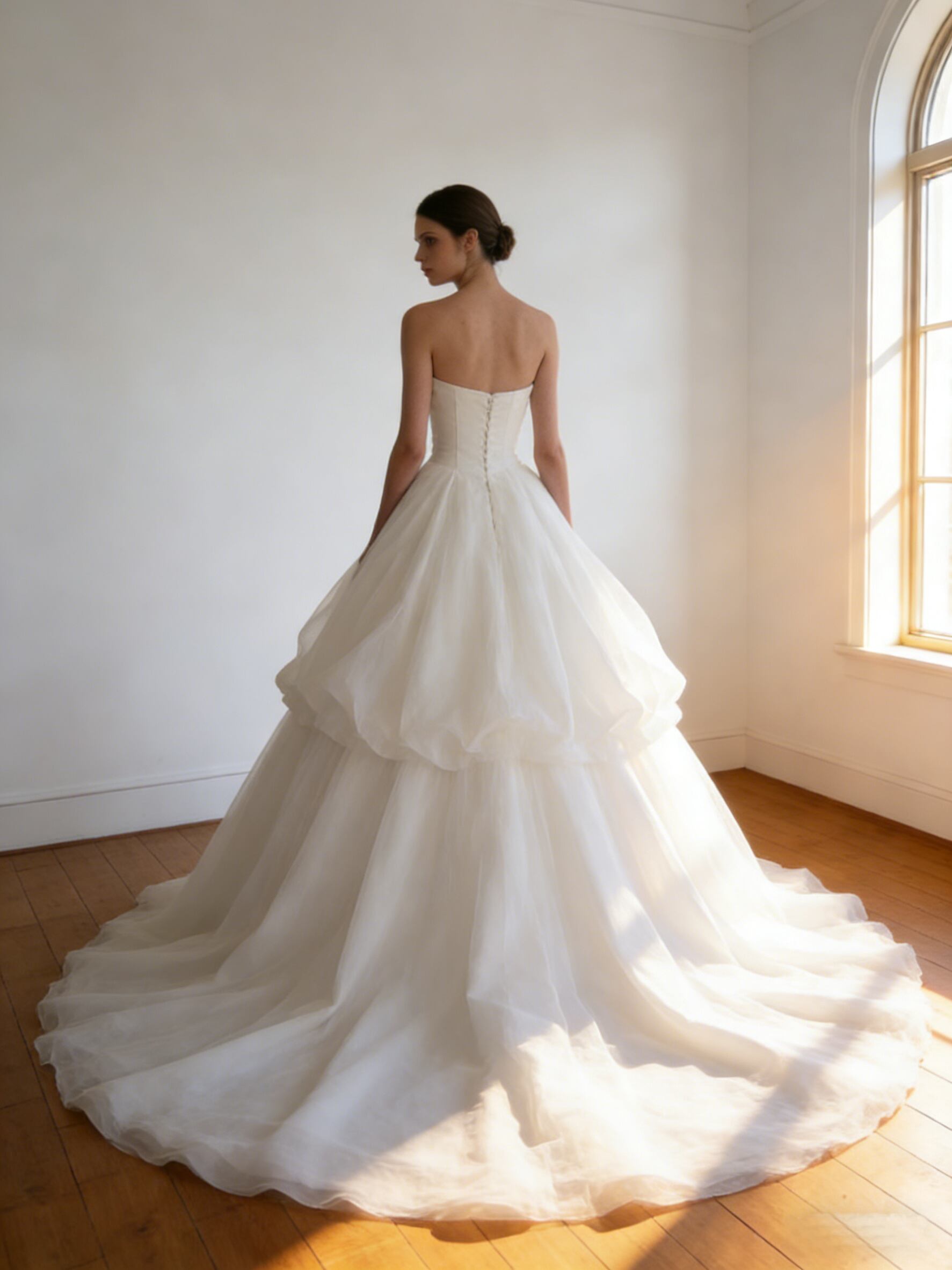 ウエディングドレス オフホワイト ソフトチュール ビスチェドレス 華やかなトレーン ブライダル