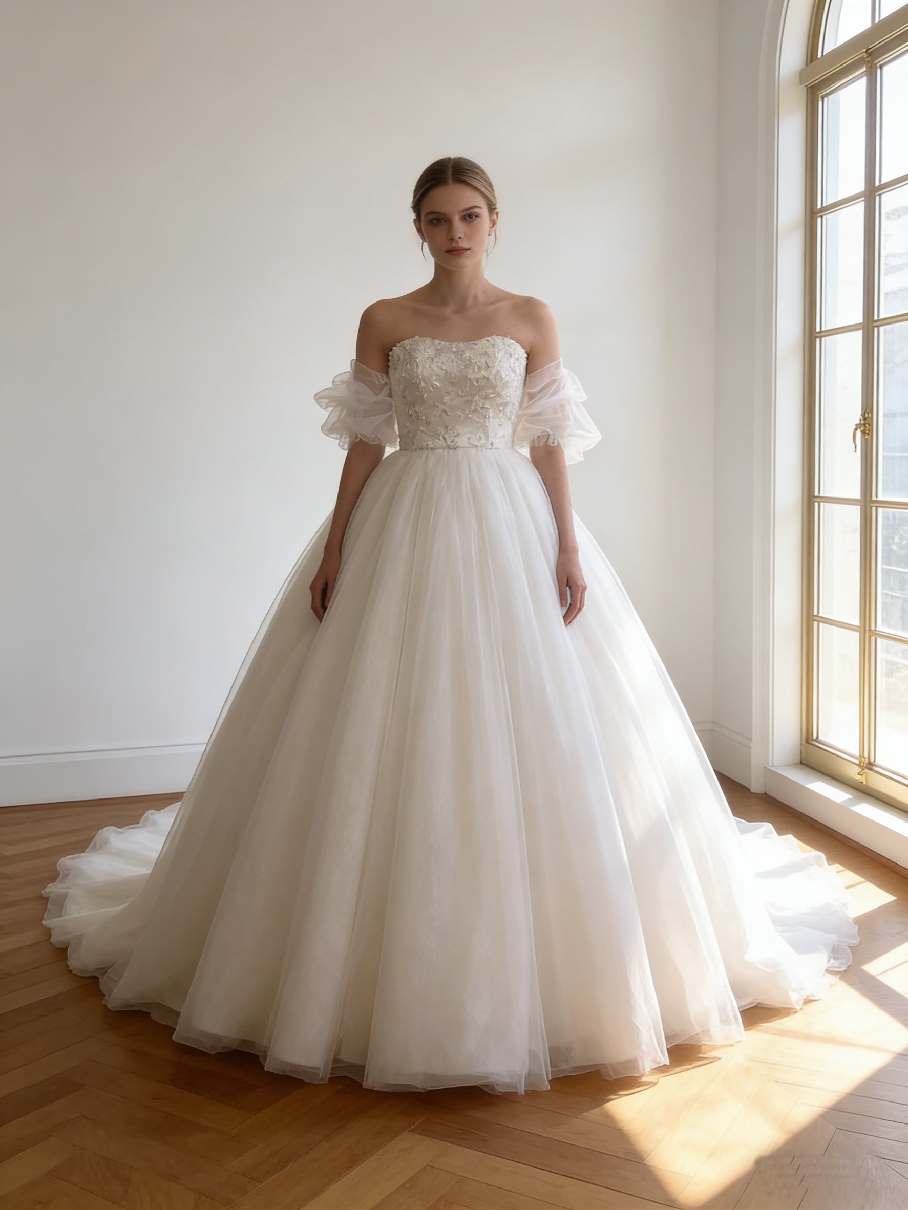 ウエディングドレス オフホワイト オフショルダー 取り外し可能な付け袖 レース ソフトチュール ブライダル
