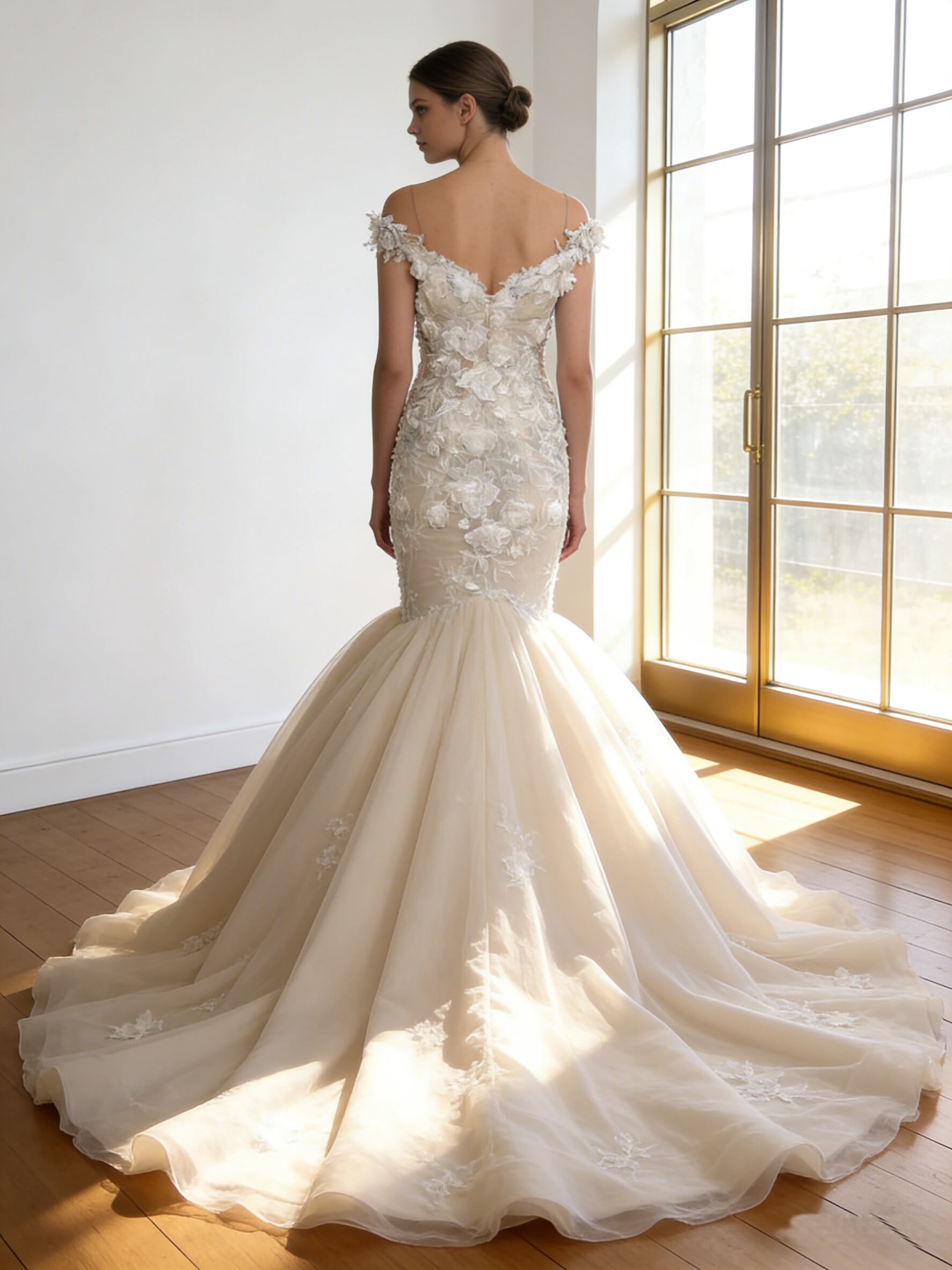 ウエディングドレス オフホワイト オフショルダー 花柄モチーフで刺繍が美しい マーメイドライン トレーン ブライダル