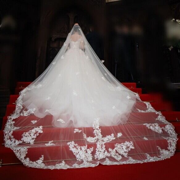 実例写真! ロングベール オフホワイト 繊細なレース 華やかなトレーン 花嫁 前撮り