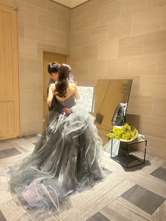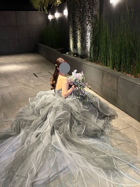 実例写真! カラードレス グレー シークインチュール ウェーブ 華やかなトレーン ブライダル