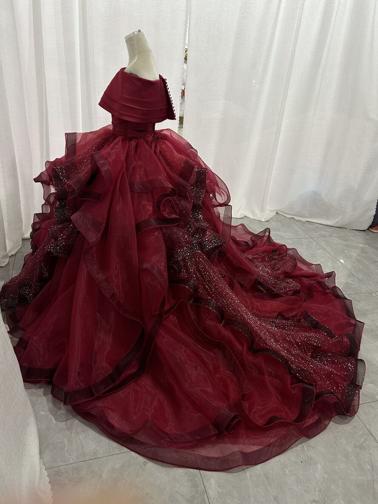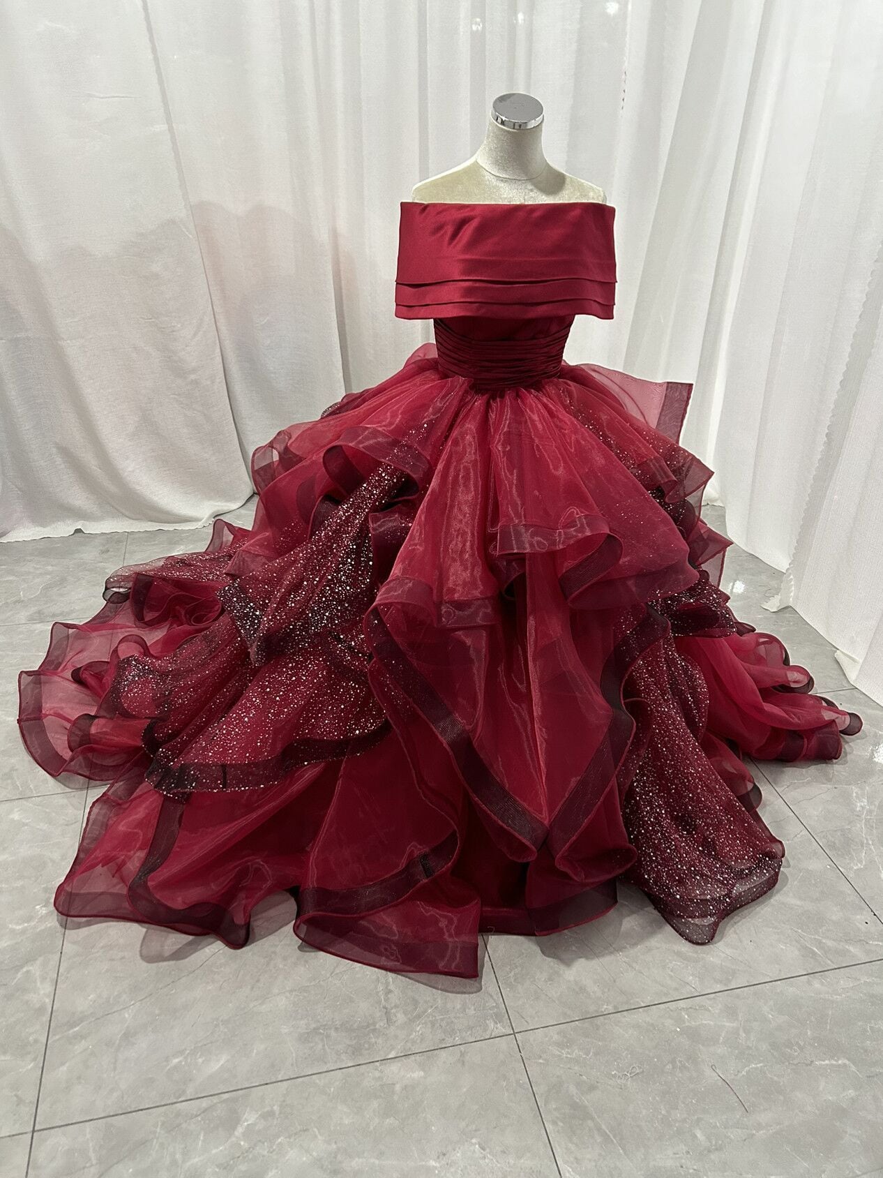 カラードレス ボルドー色 ロールカラー シークインチュール 華やかなトレーン アシンメトリードレス ブライダル