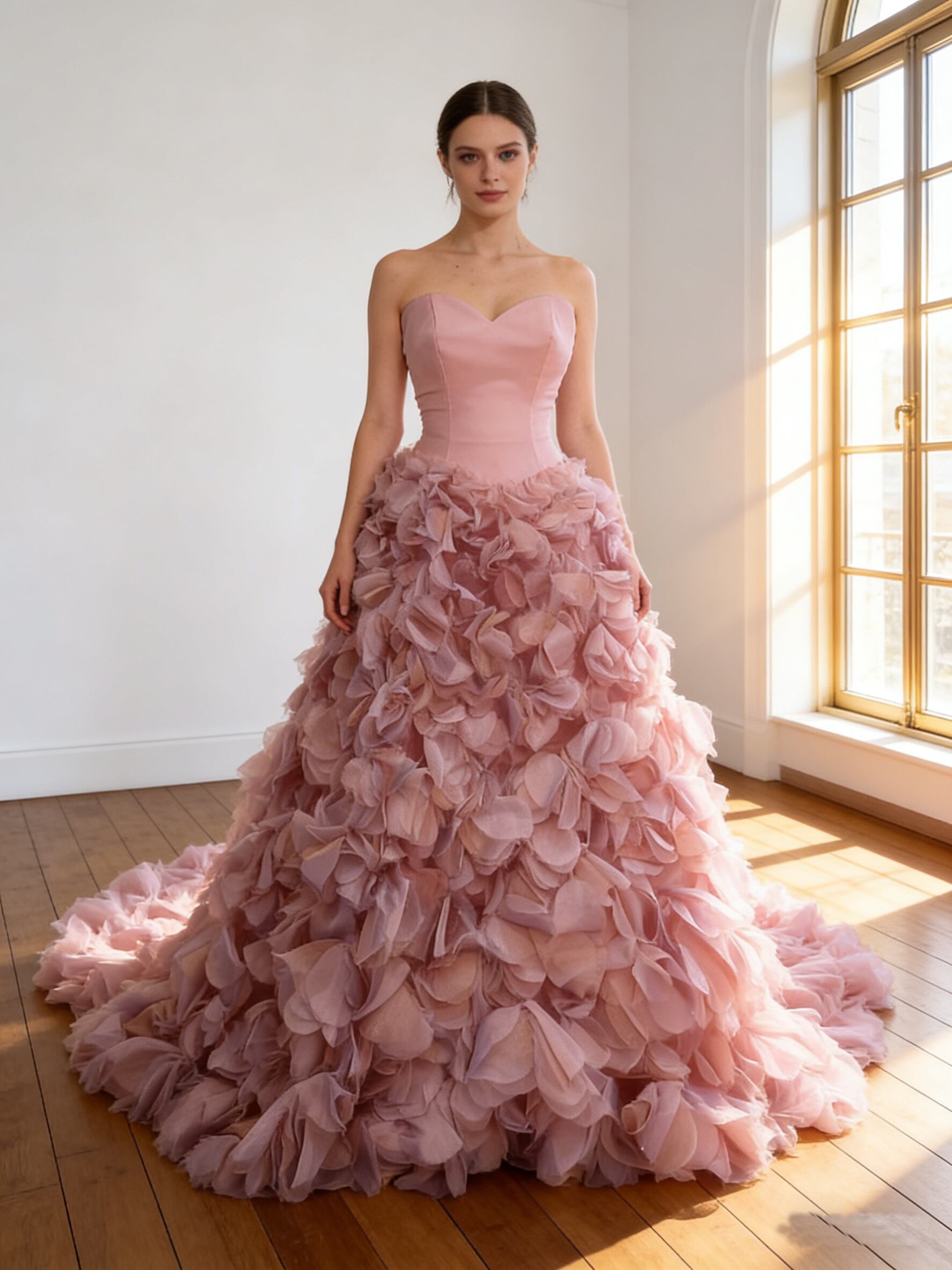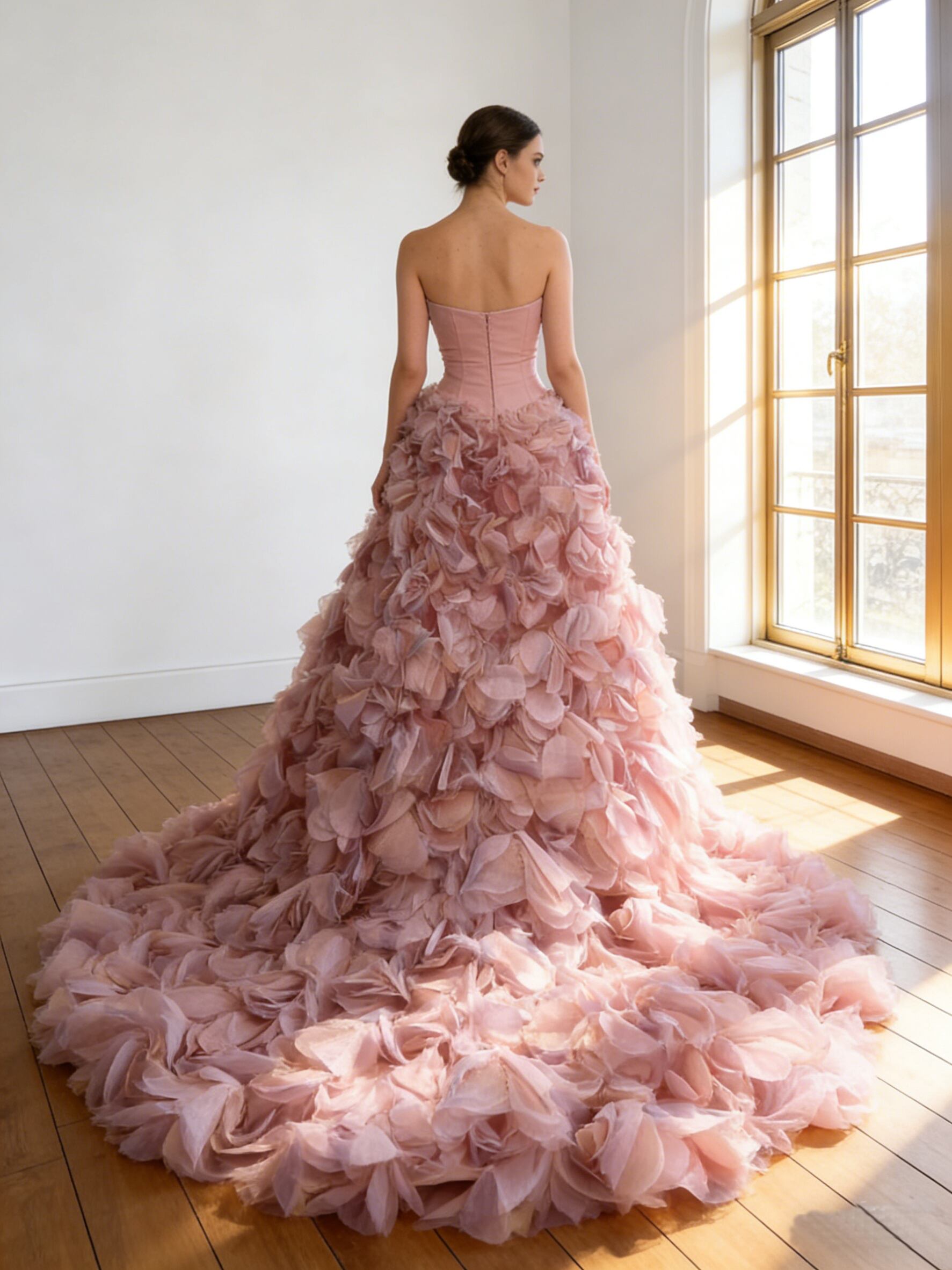 カラードレス ピンク ビスチェドレス 韓国風ドレス アシンメトリー風 華やかなトレーン 花嫁 前撮り
