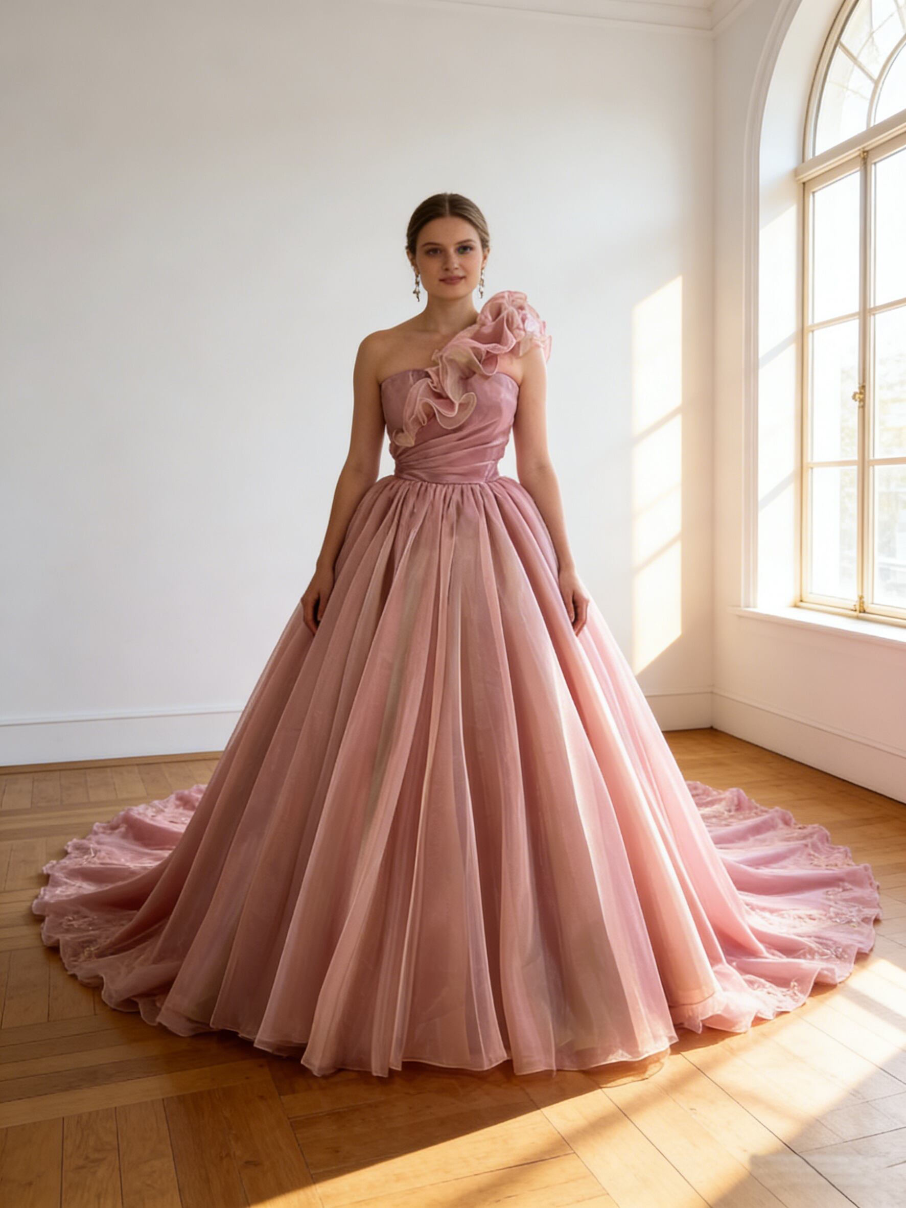 カラードレス ピンク ショルダー型 ソフトチュール 華やかなトレーン 目立つ 演奏会/音楽会 花嫁