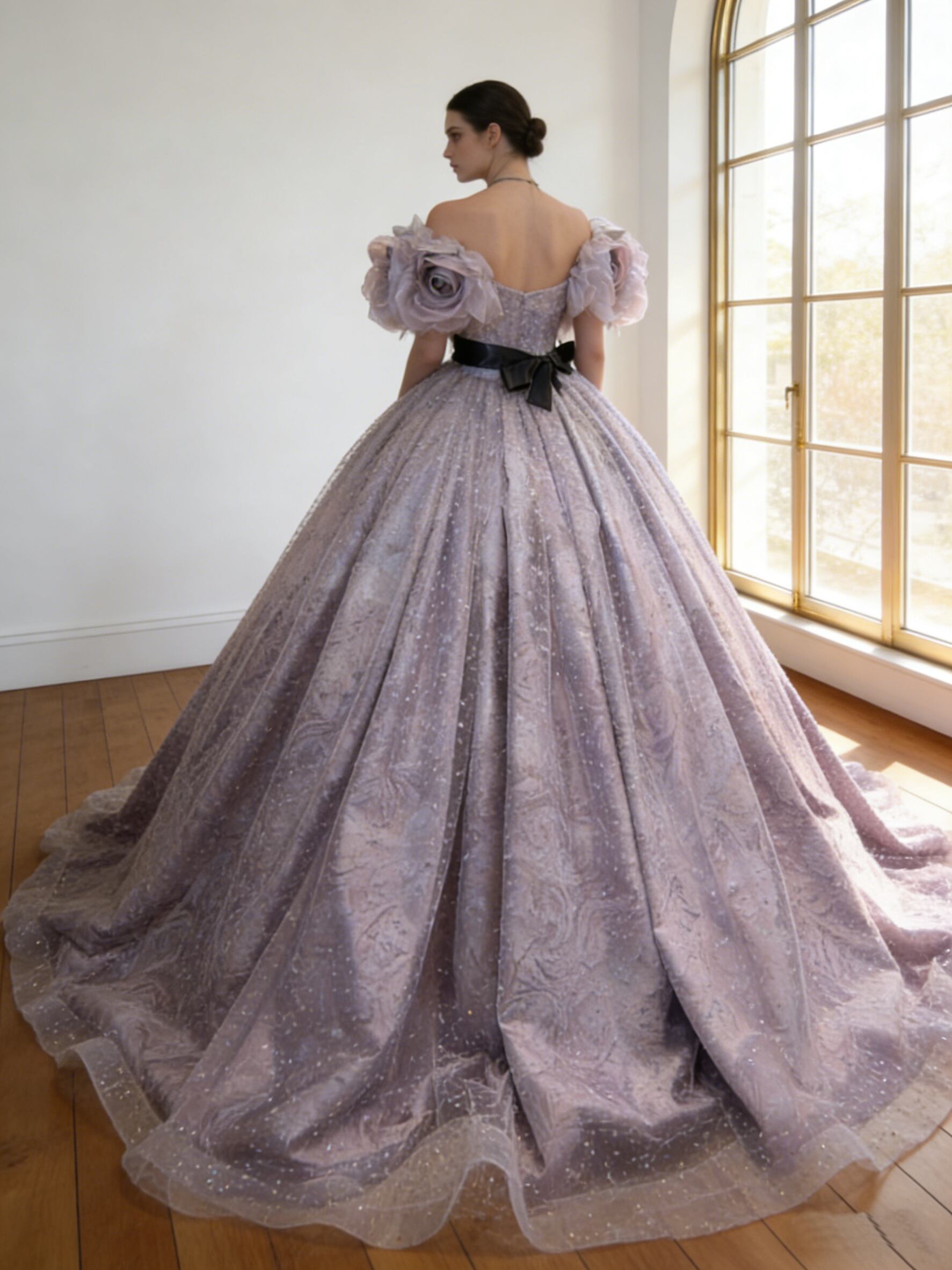 カラードレス パープル バラトレーン フリルオフショルダー サッシュベルト シークインチュール 花嫁 前撮り