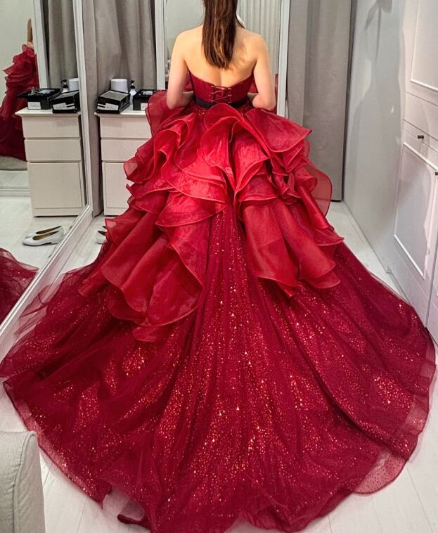 カラードレス ボルドー色 シークインチュール アシンメトリー風 サッシュベルト トレーン 花嫁 前撮り