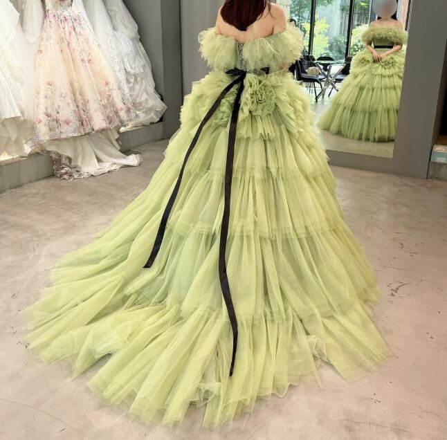カラードレス グリーン オフショルダー サッシュベルト ボリュームドレス トレーン 結婚式