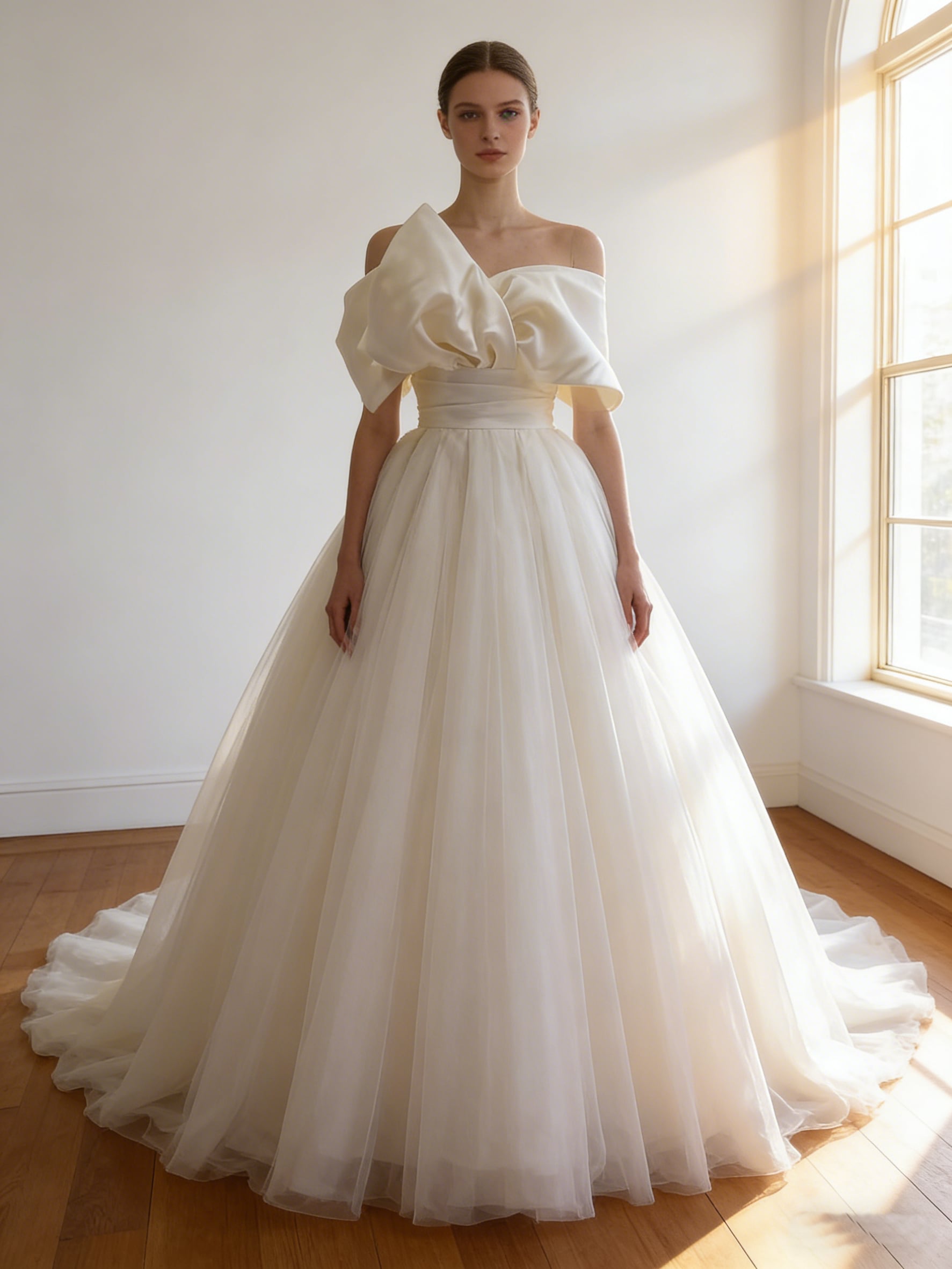 ウエディングドレス オフホワイト オフショルダー 光沢サテン リボン ソフトチュール 結婚式