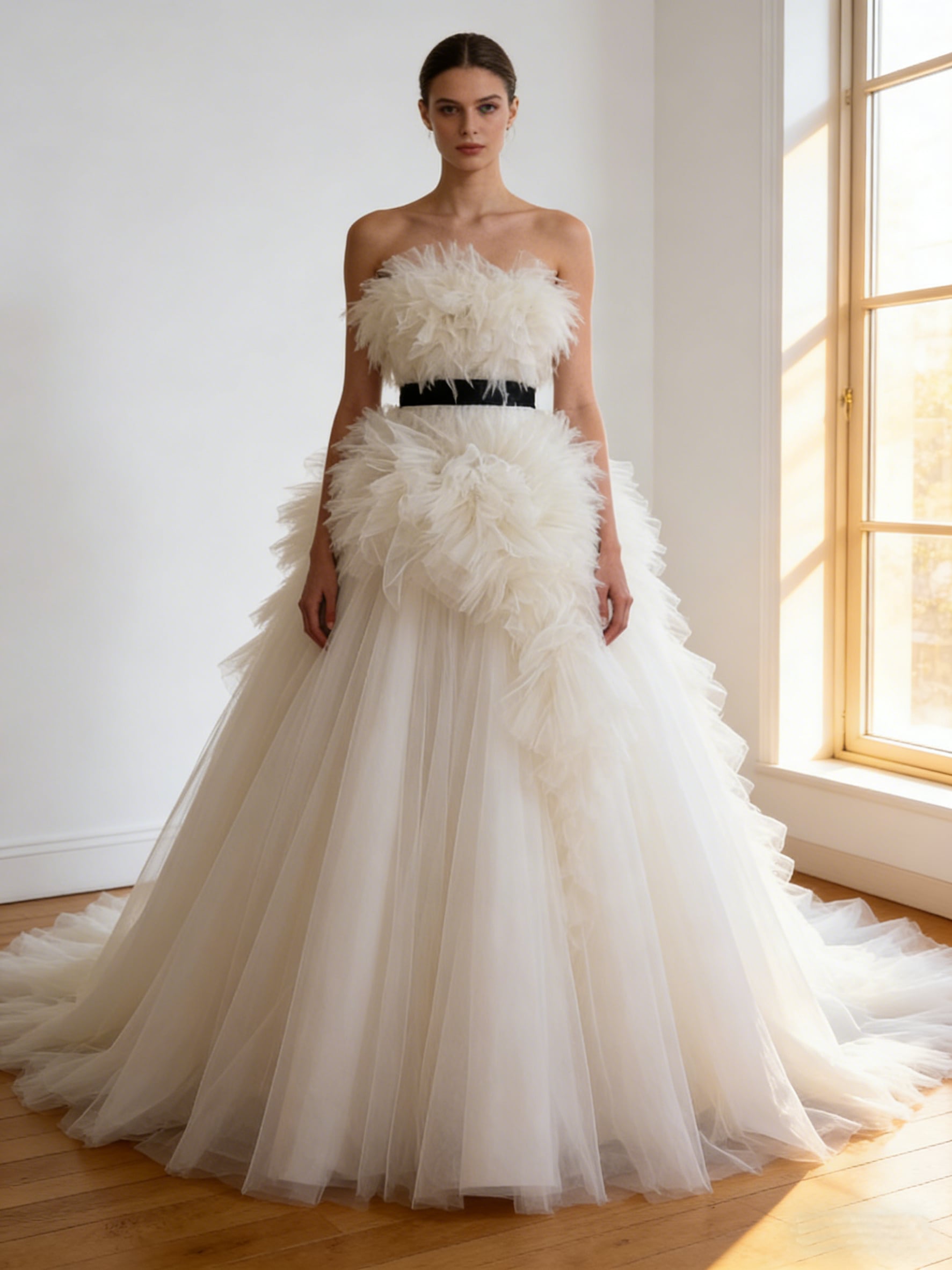 ウエディングドレス オフホワイト ビスチェドレス ボリュームドレスサッシュベルト ソフトチュール ブライダル