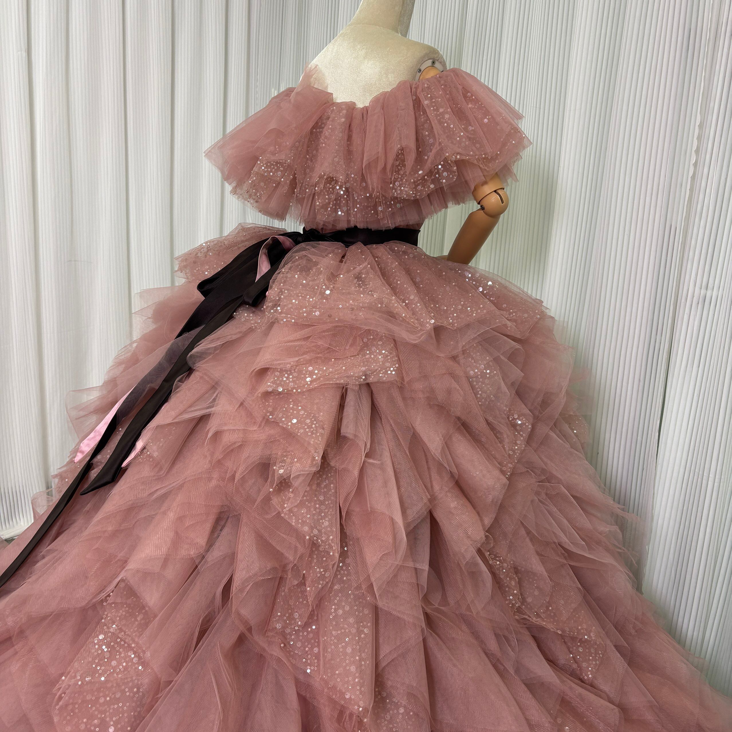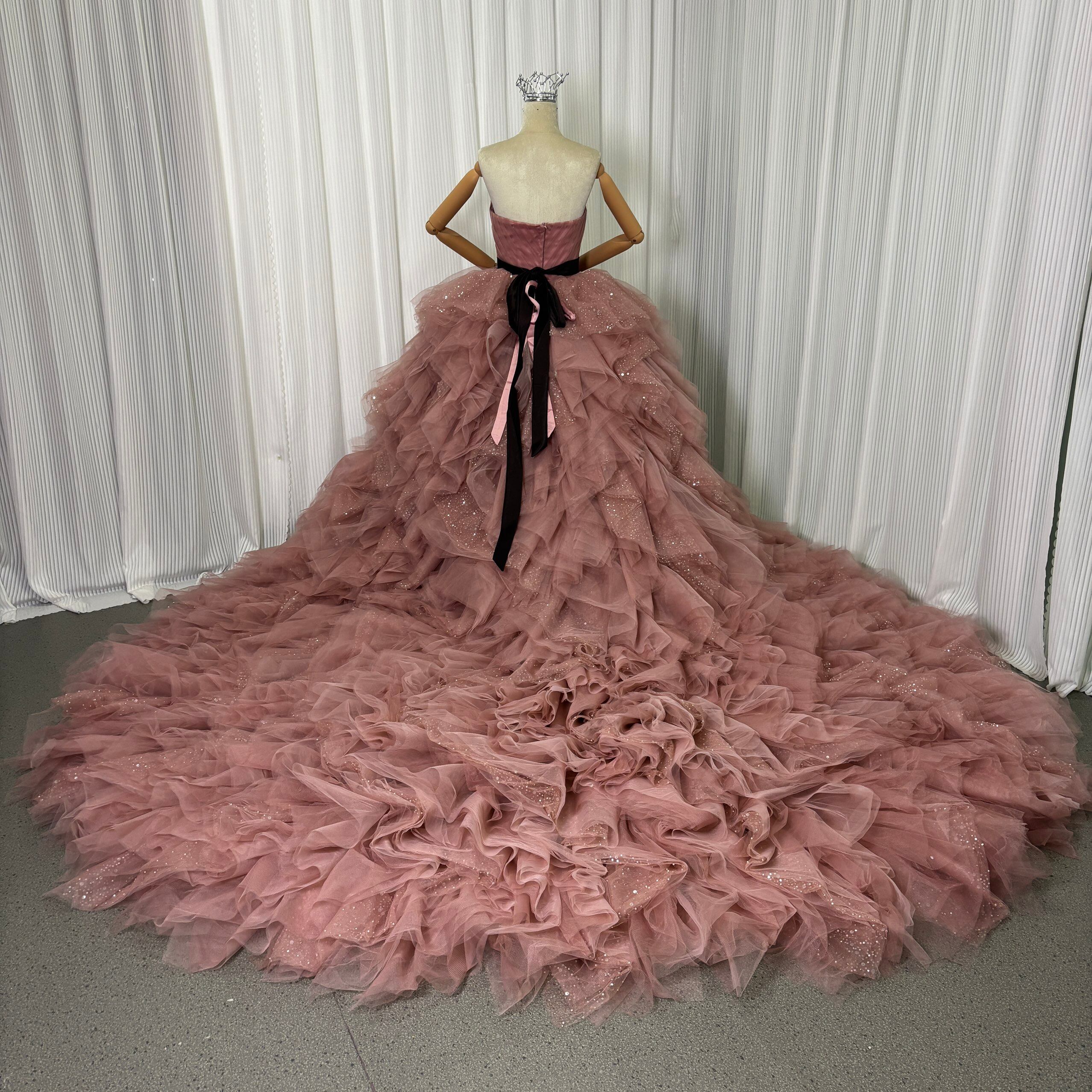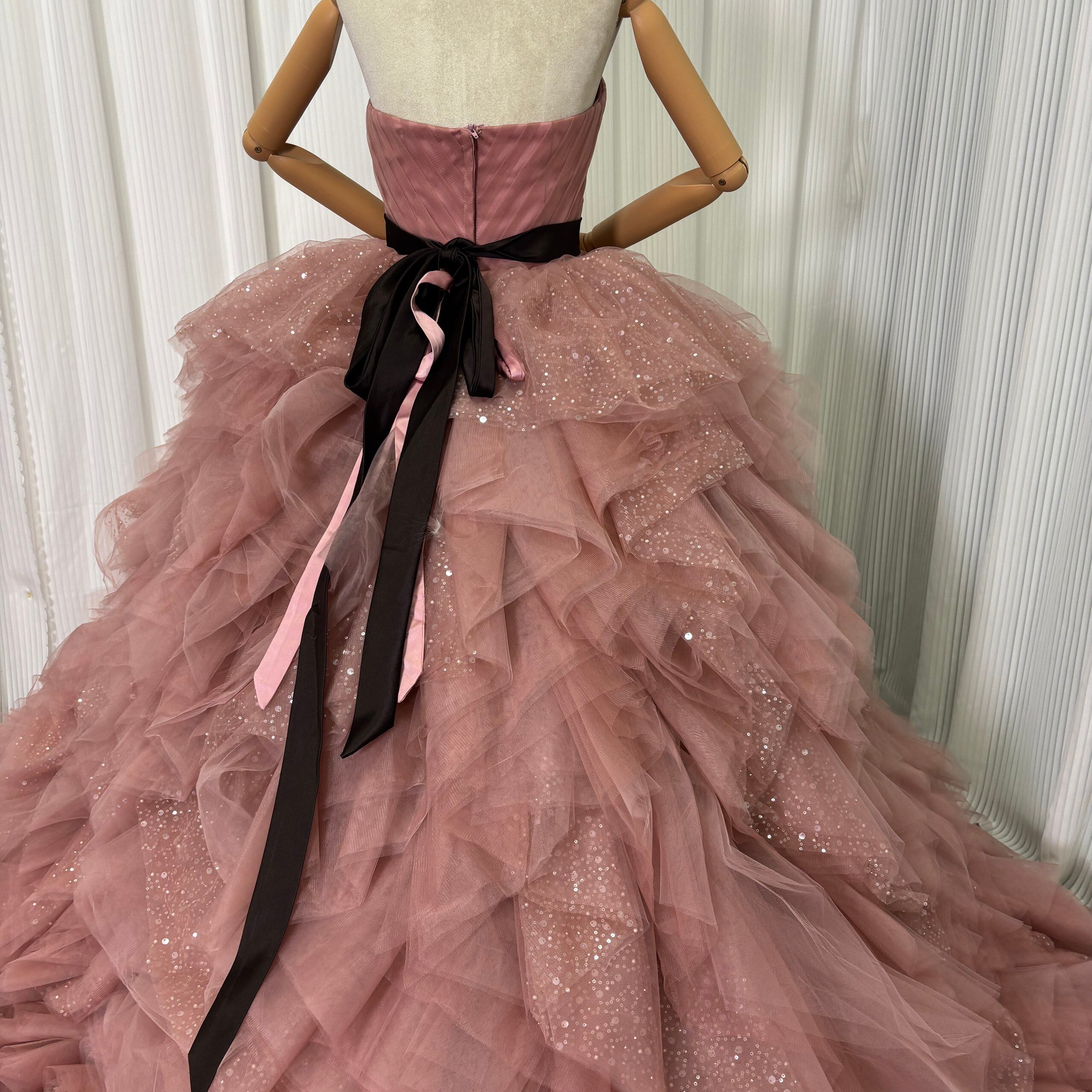 カラードレス くすみピンク 取り外し可能なオフショルダー インポートビジューレース ボリュームドレス ツーピース 結婚式