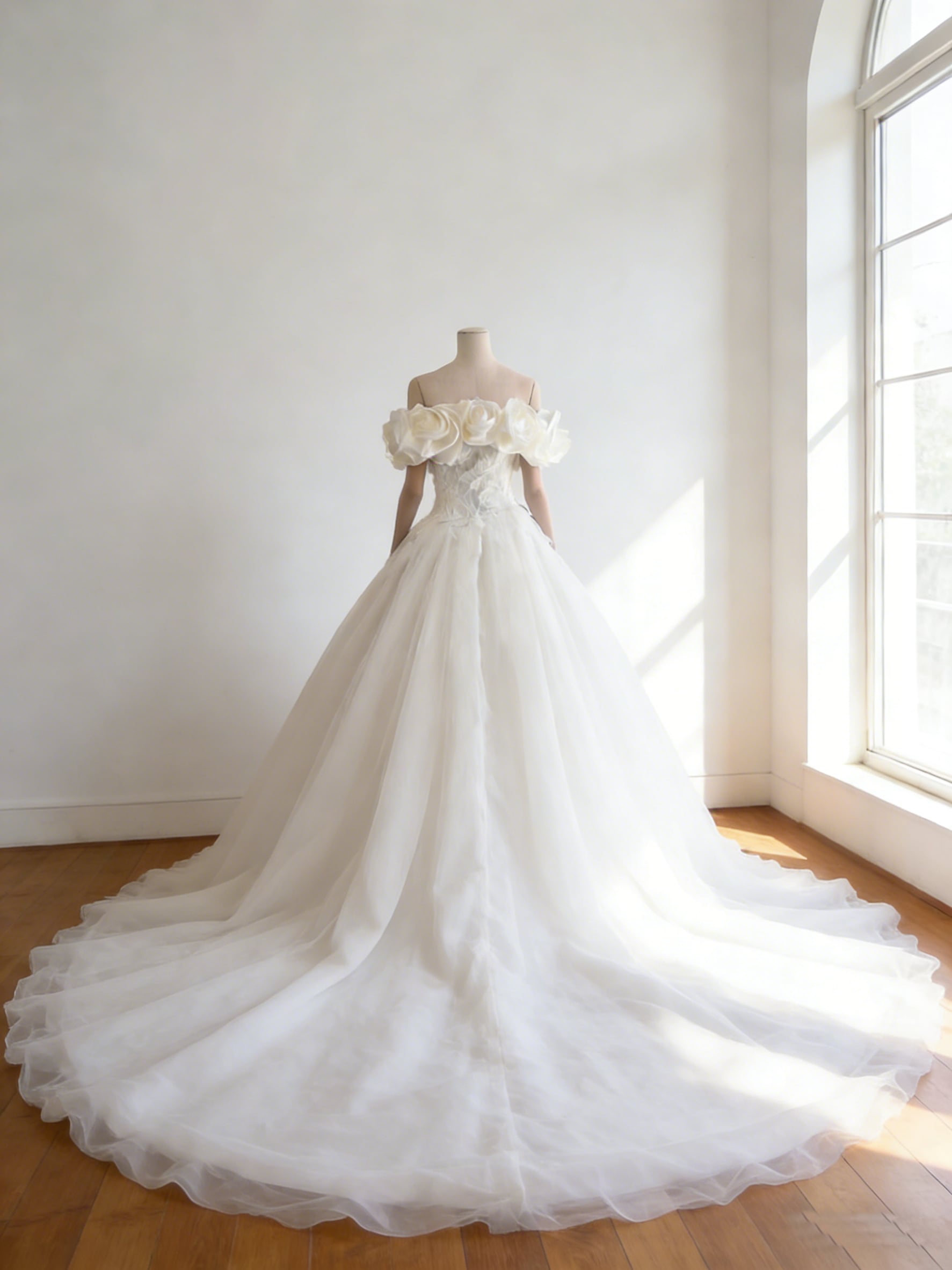 ウエディングドレス オフホワイト オフショルダー バラトレーン ソフトチュール 華やかなトレーン ブライダル