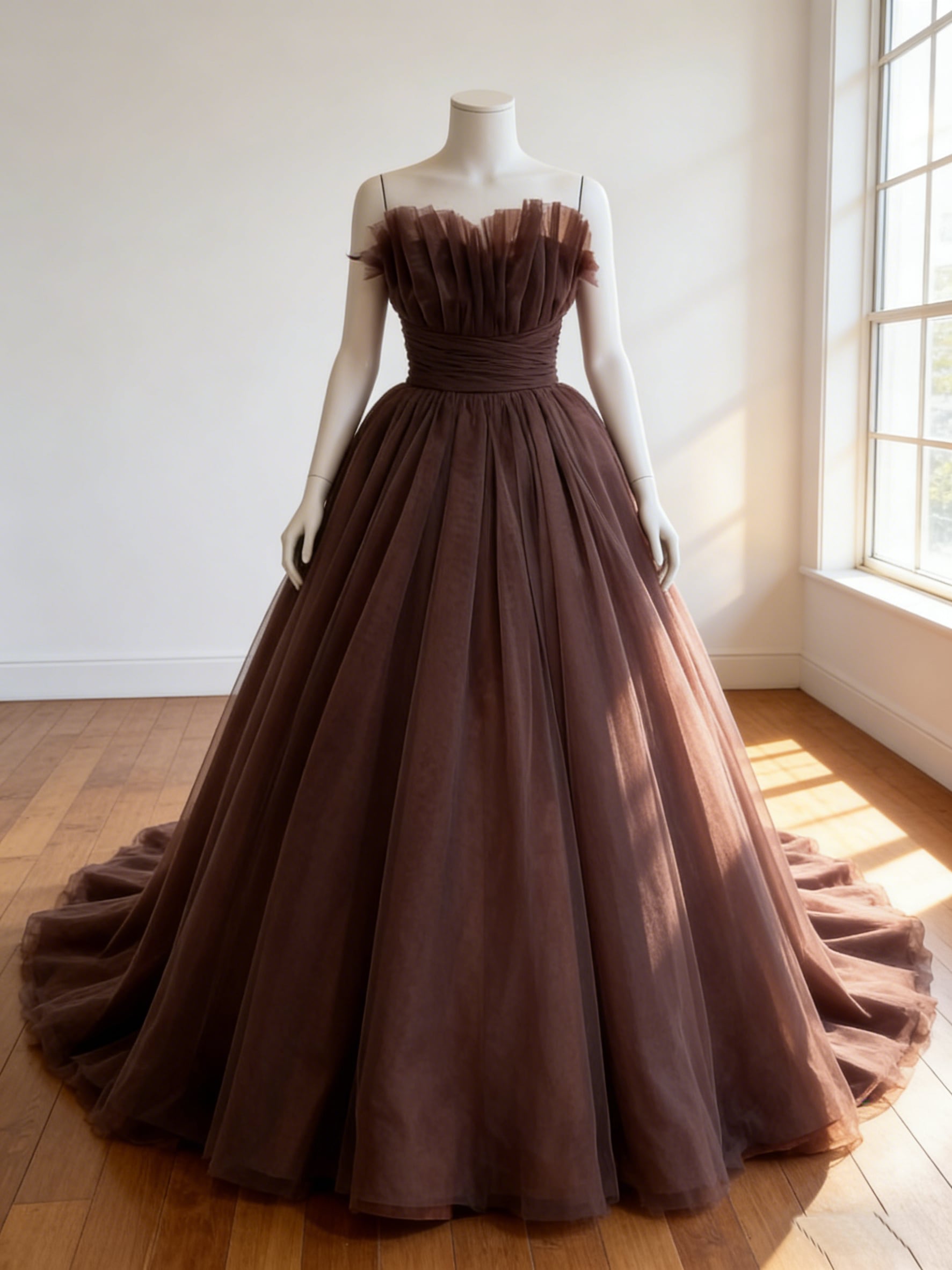 カラードレス ブラウン ビスチェドレス ソフトチュール ロングトレーン 演奏会/音楽会 花嫁