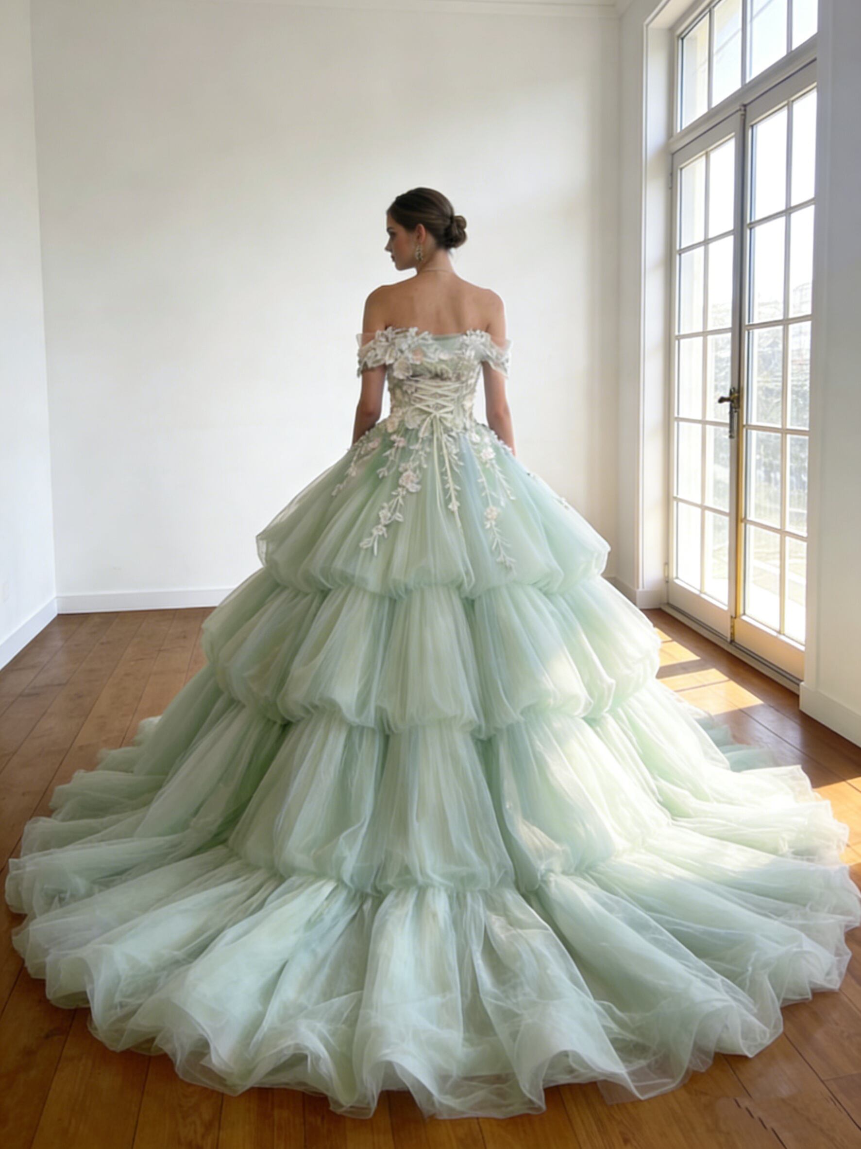 カラードレス グリーン オフショルダー 花モチーフ ボリュームドレス 華やかなトレーン 花嫁 前撮り