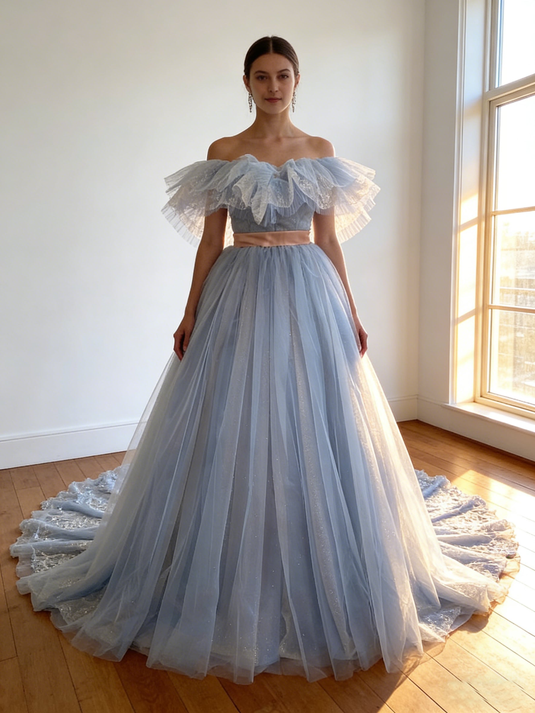 カラードレス ブルー オフショルダー サッシュベルト ソフトチュール 上品な花レース 花嫁 前撮り