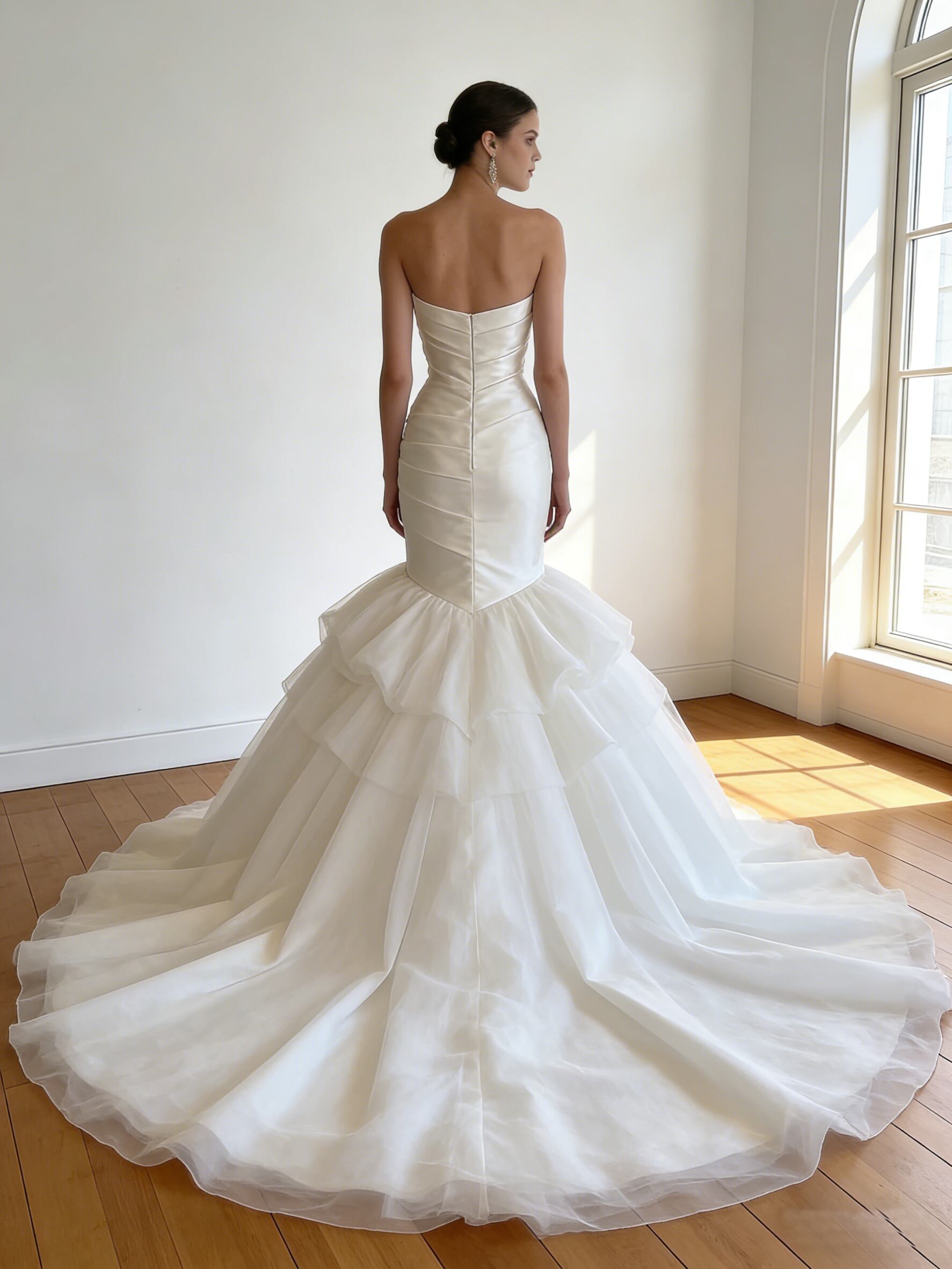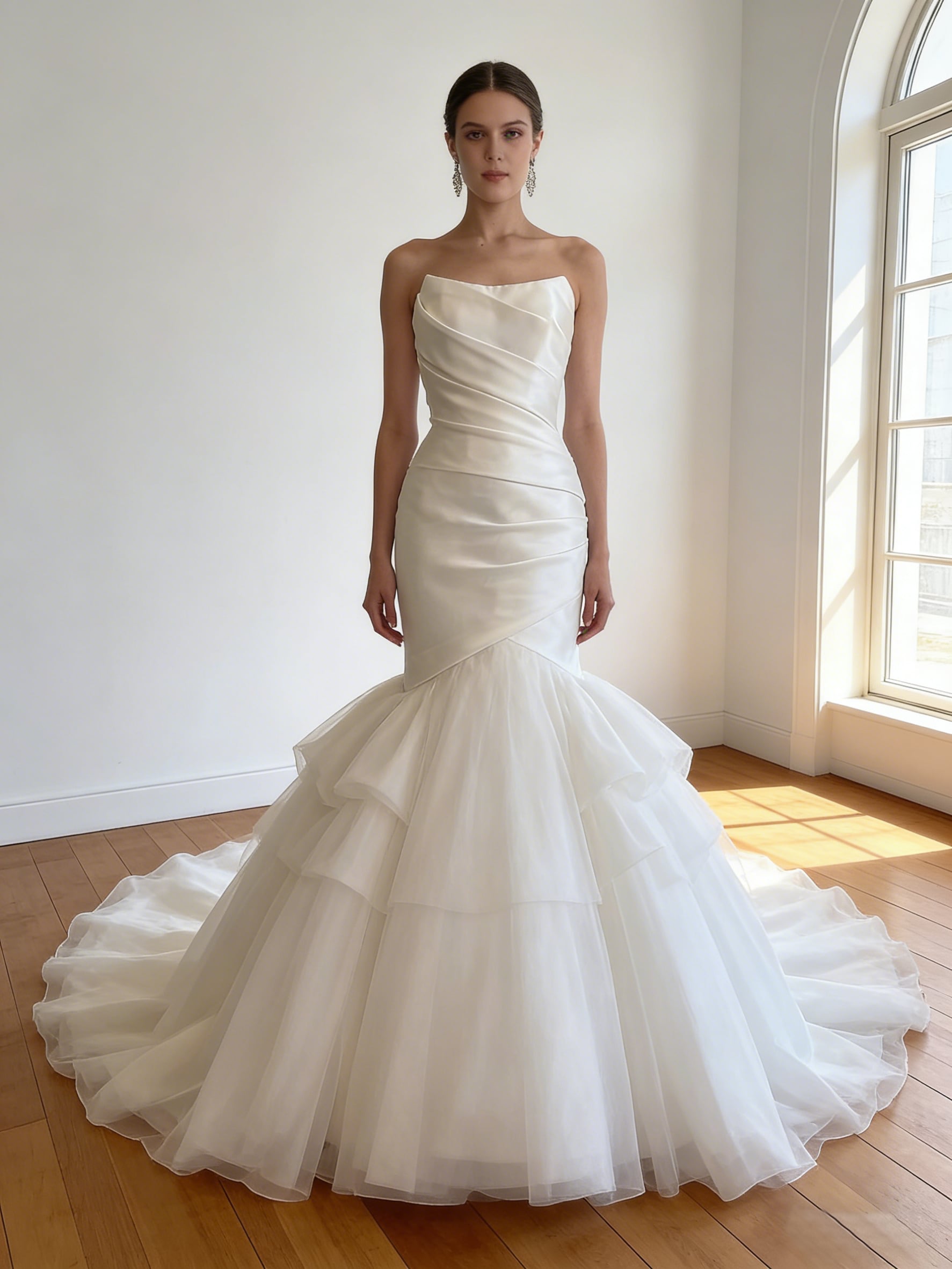 ウエディングドレス オフホワイト 光沢サテン+ソフトオーガンジー 細見えシルエット マーメイドライン ブライダル