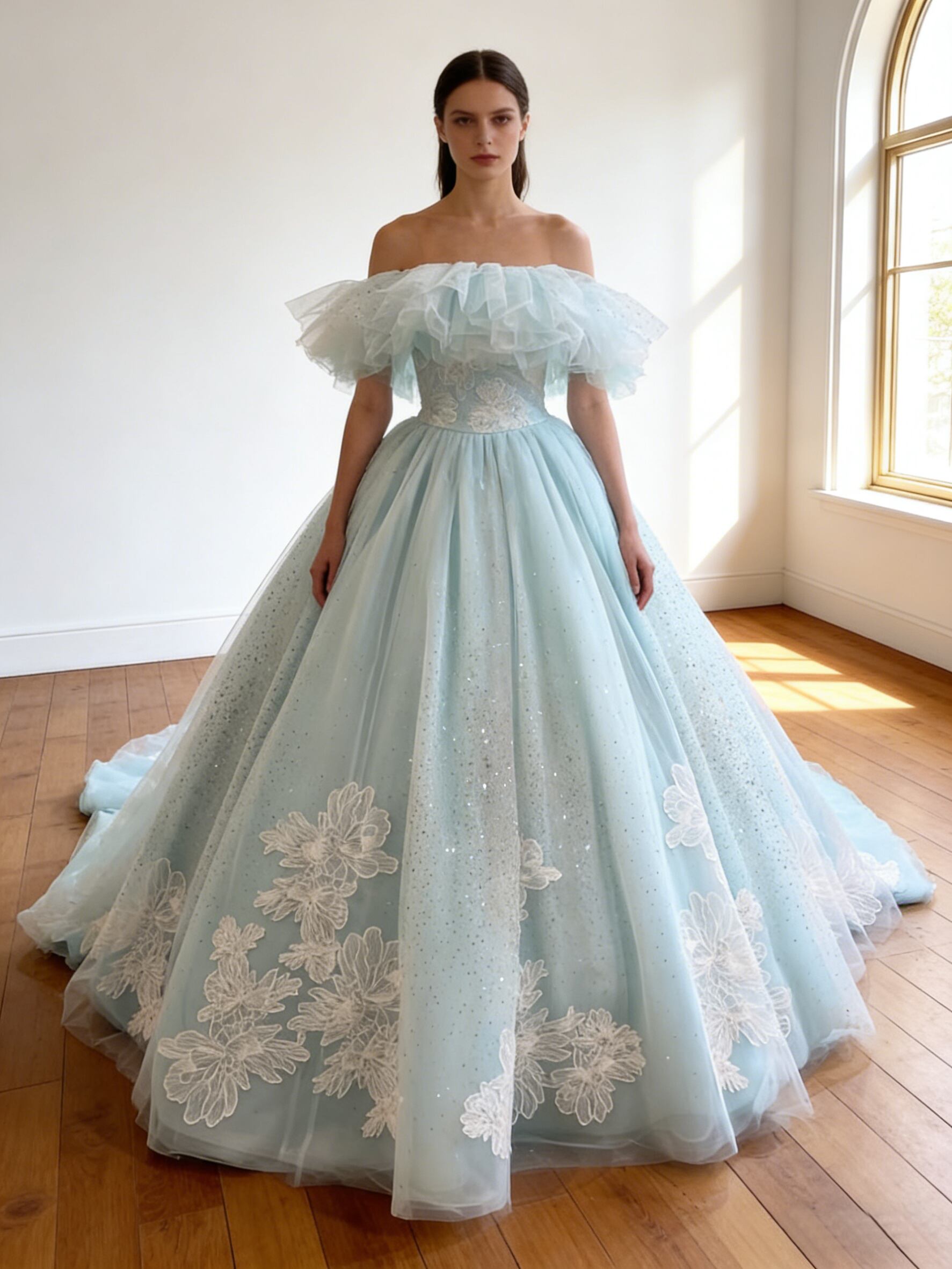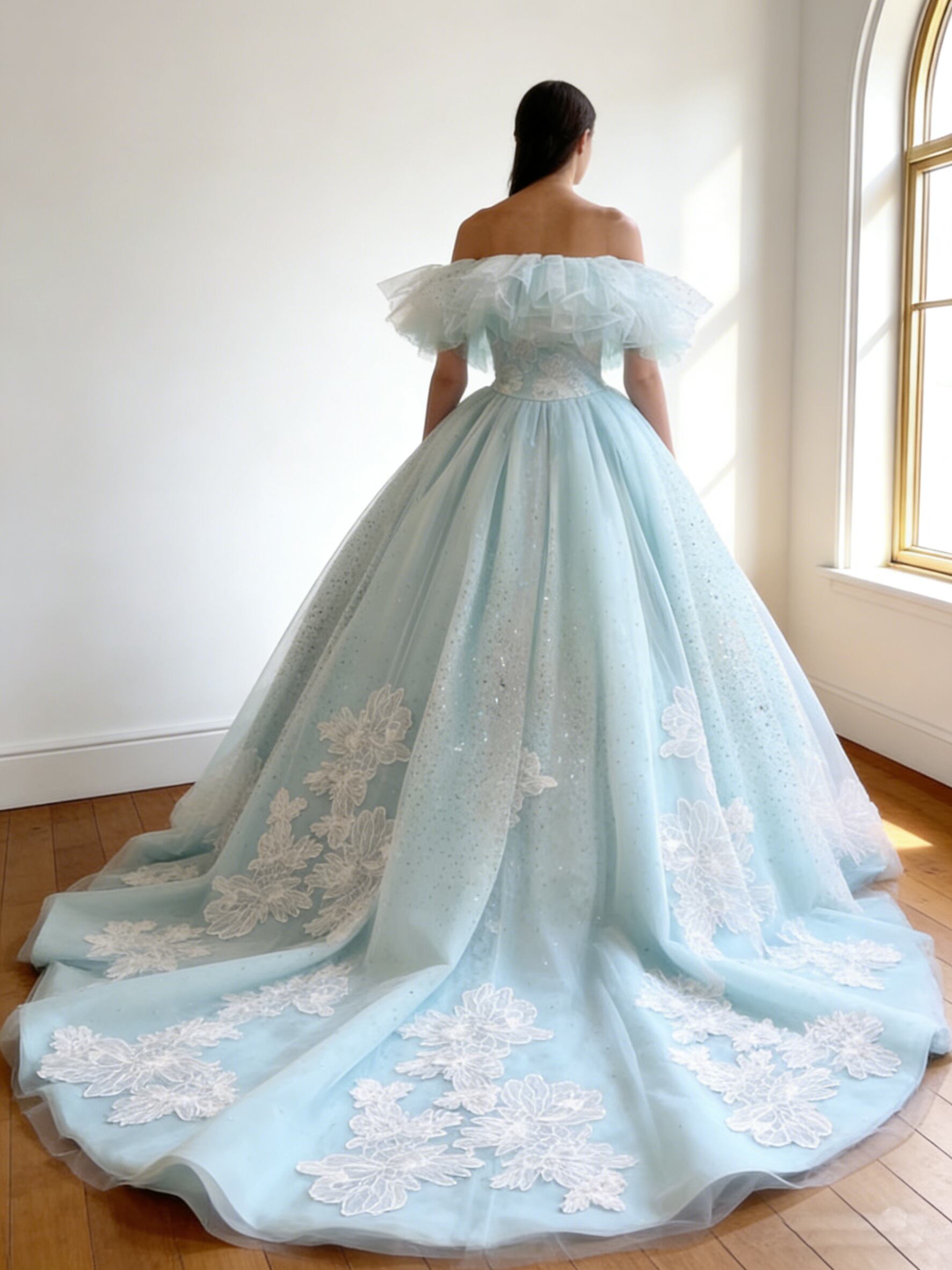 カラードレス 薄青 取り外し可能なオフショルダー 花柄モチーフで刺繍が美しい シークインチュール 華やかなトレーン 花嫁