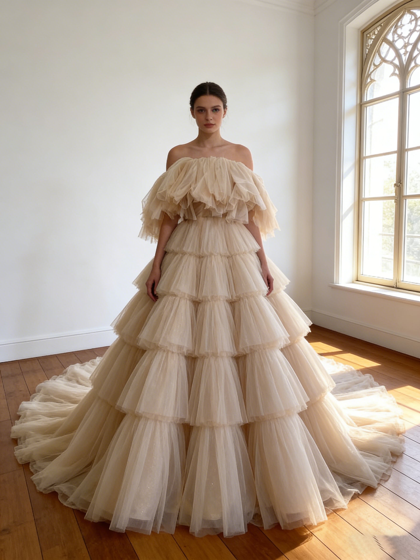 カラードレス シャンパン色 オフショルダー ソフトチュール ボリュームドレス ロングトレーン 花嫁