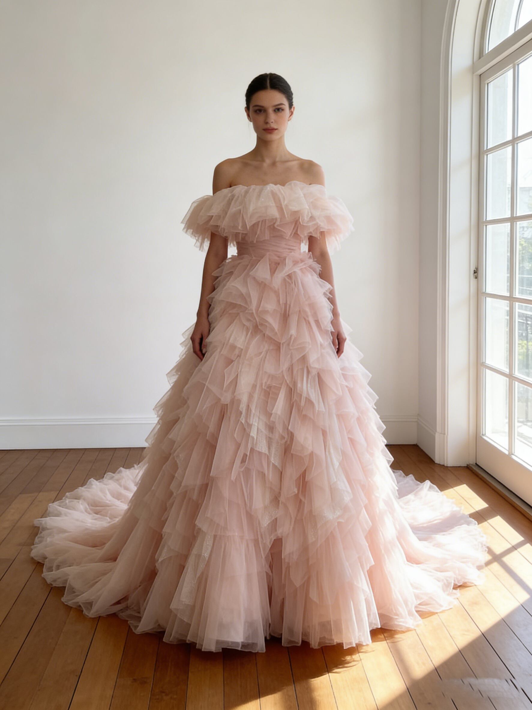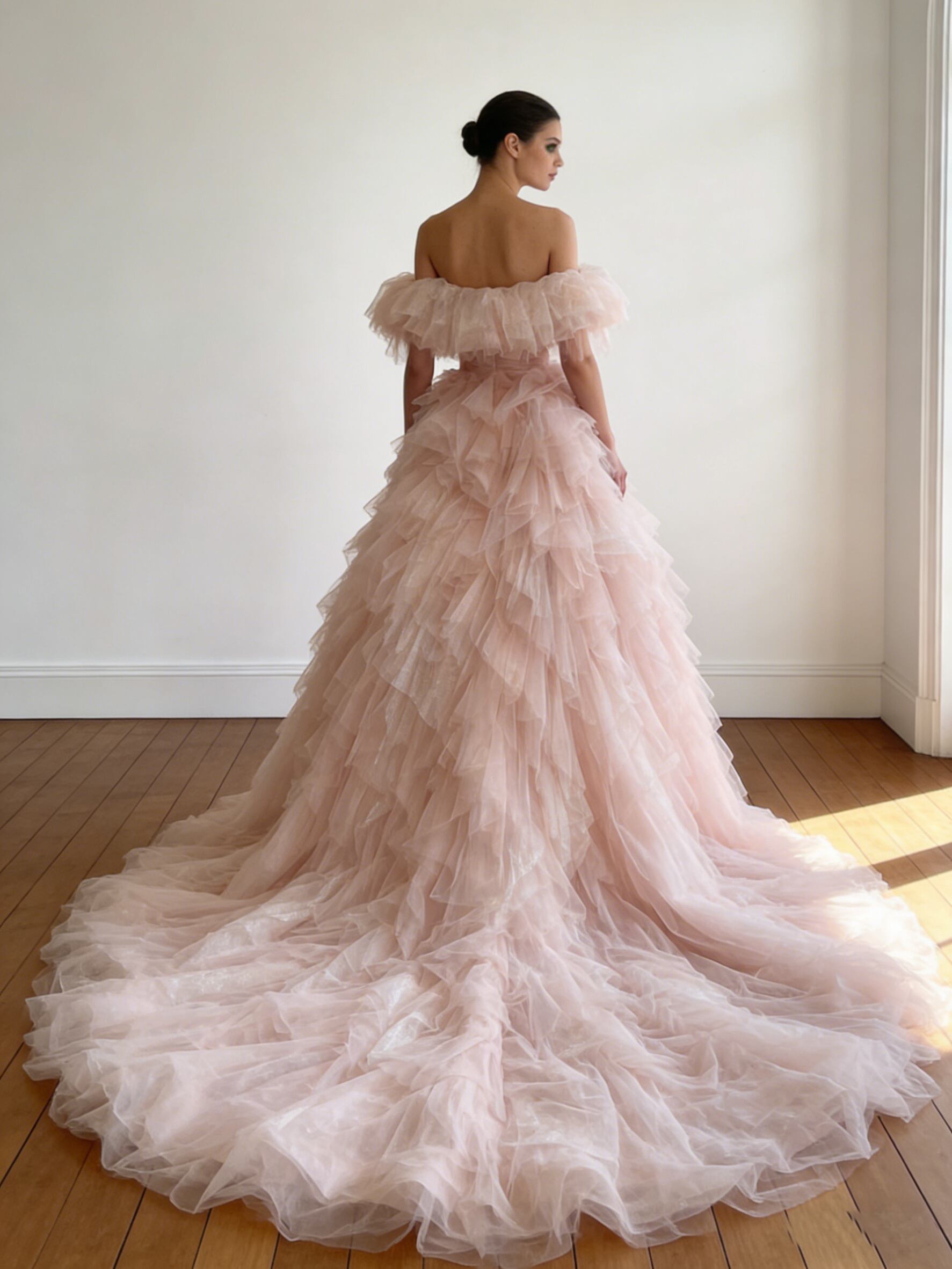 カラードレス ピンク オフショルダー アシンメトリー風 ロングトレーン 柔らかく重ねたチュールスカート 花嫁