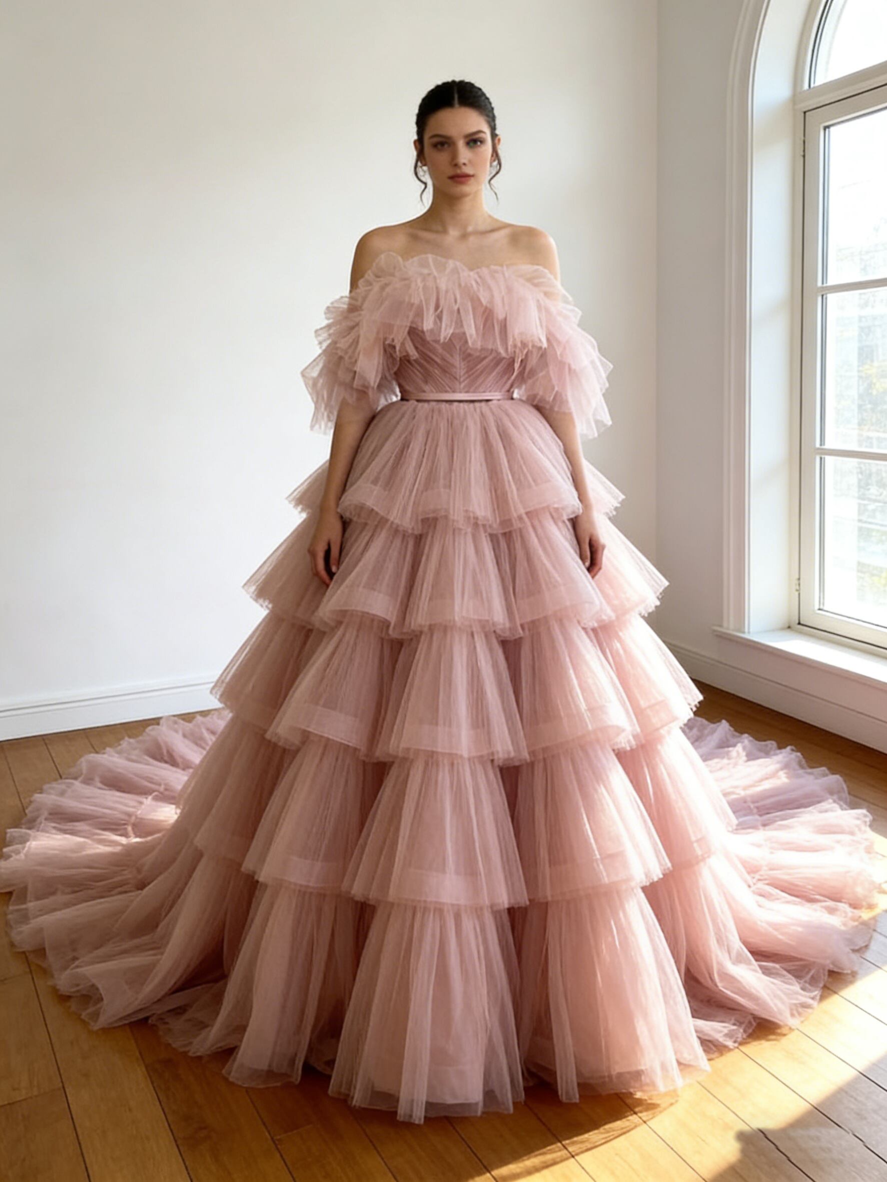 カラードレス ピンク オフショルダー レイヤードドレス ロングトレーン 柔らかく重ねたチュールスカート 花嫁